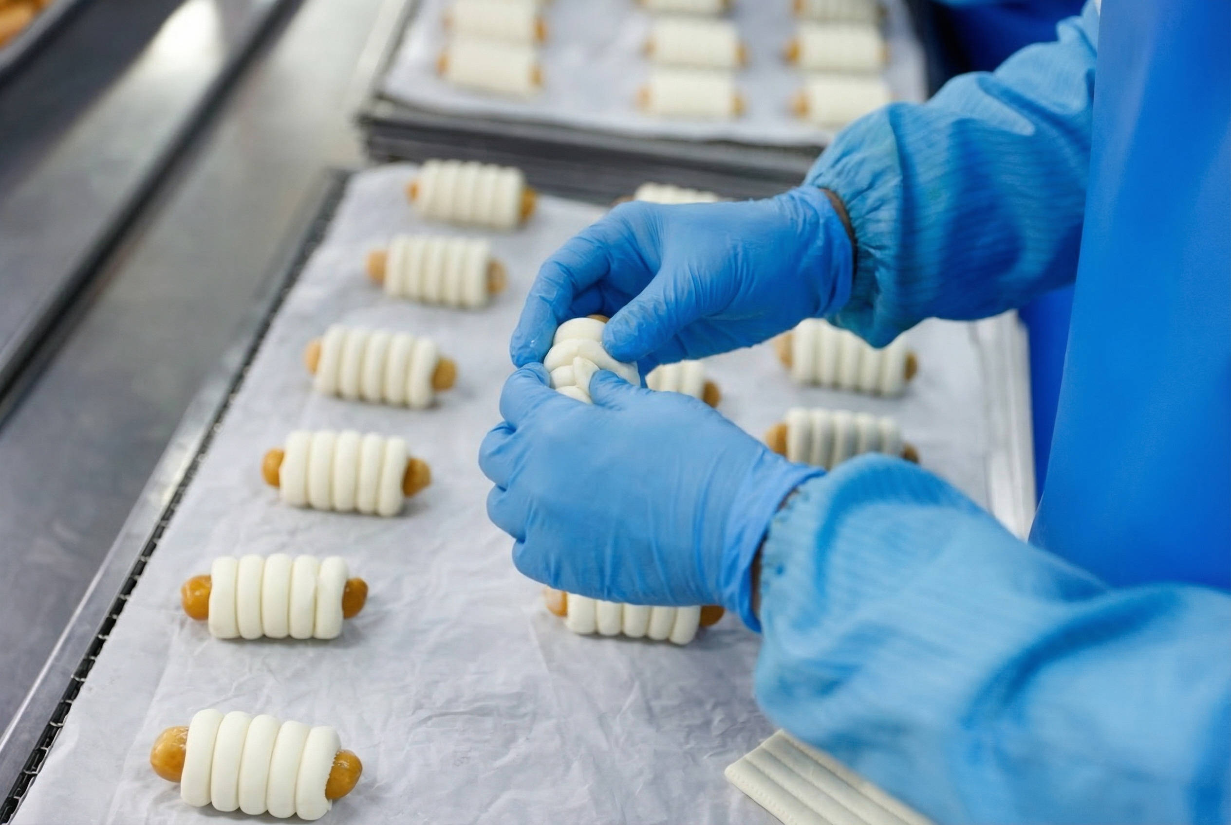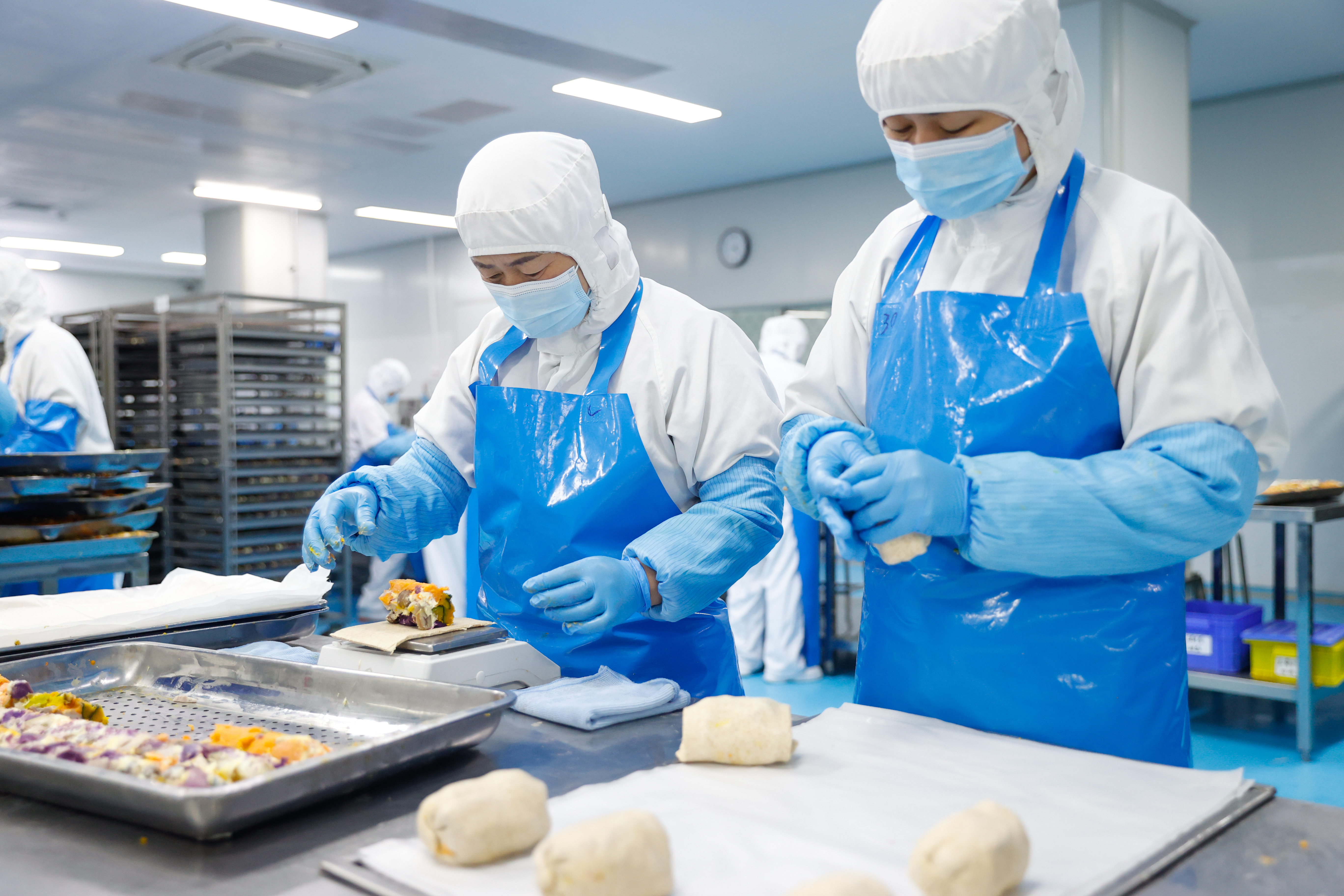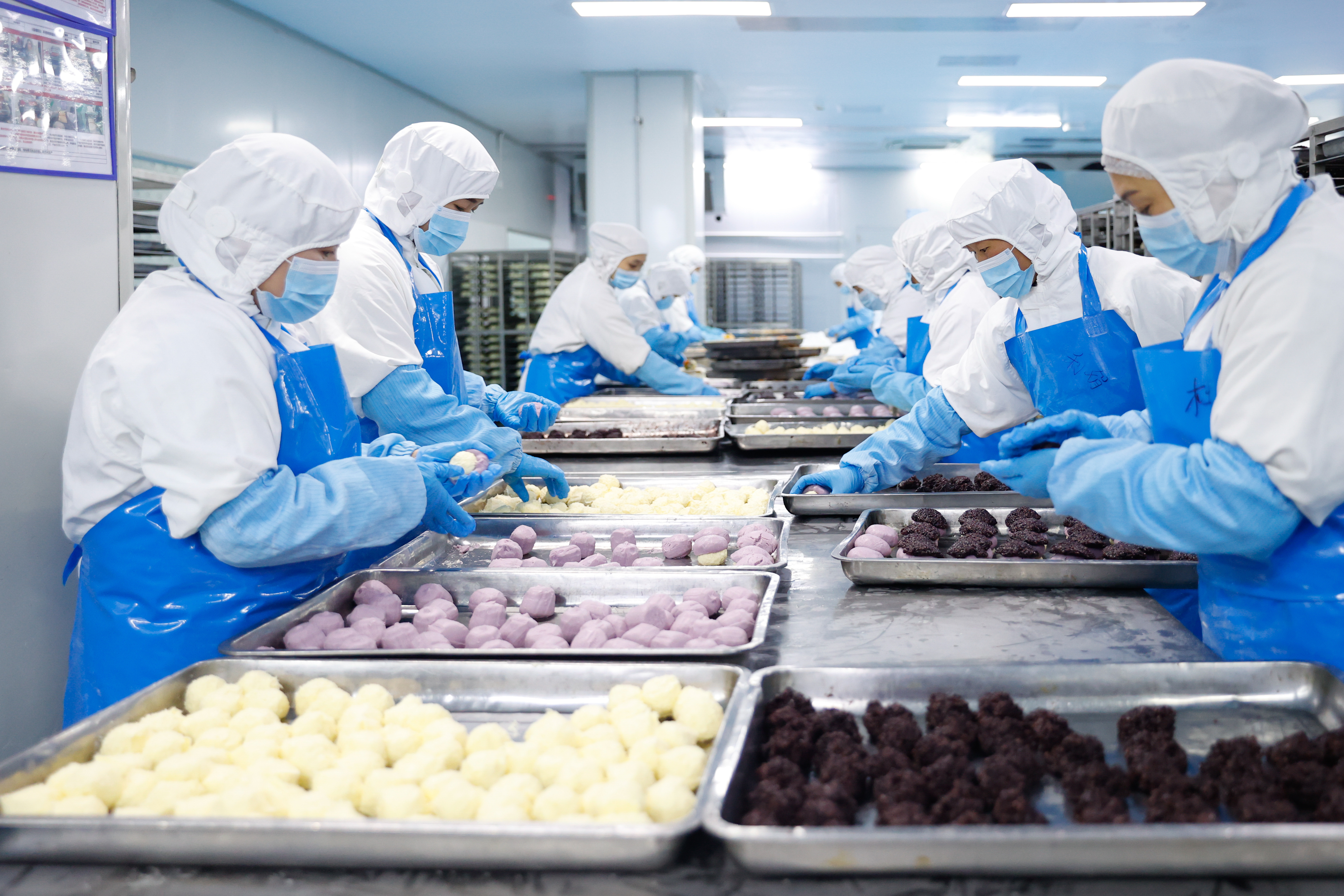 一个个初见雏形的面点整齐排列,等待进入下一道工序。