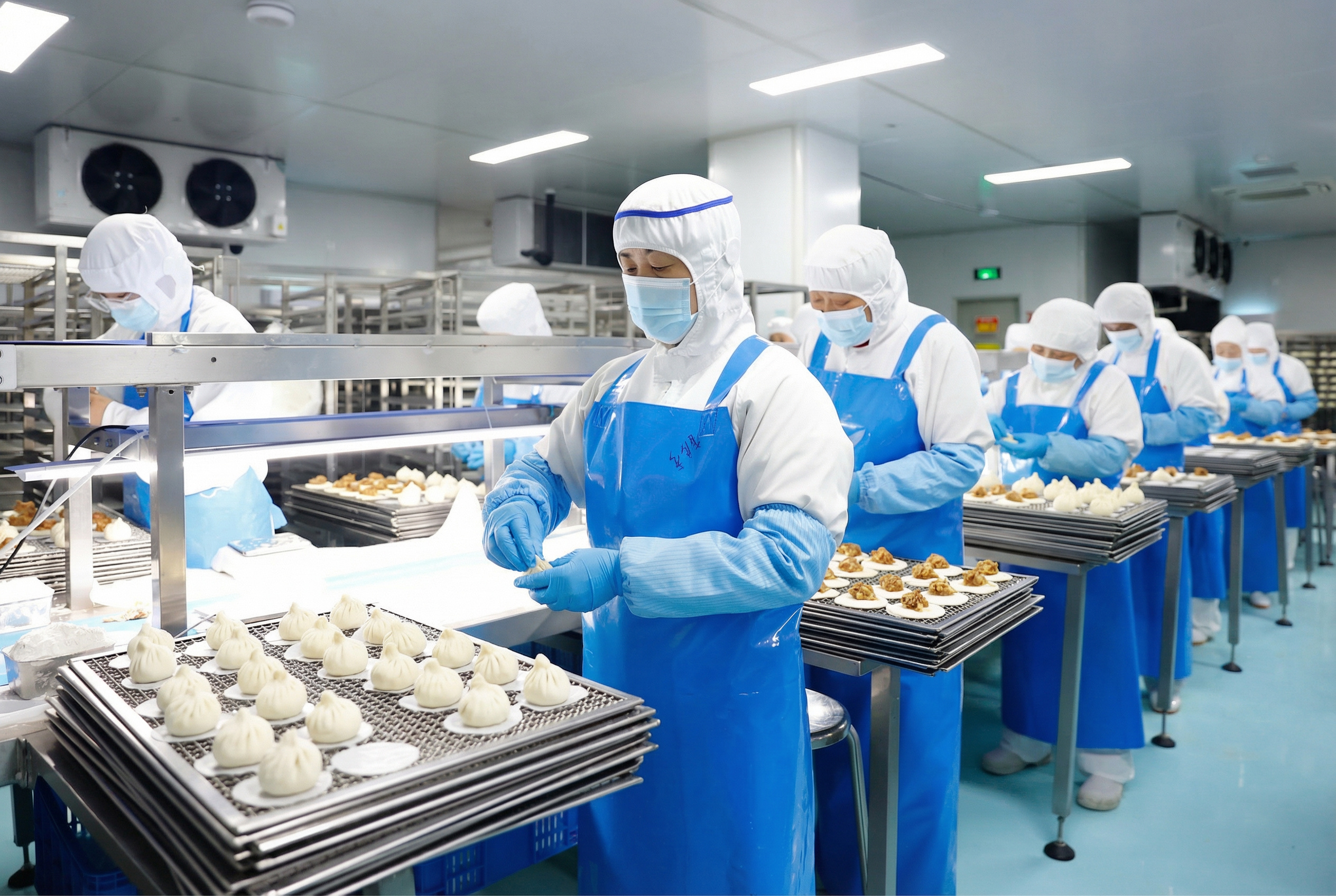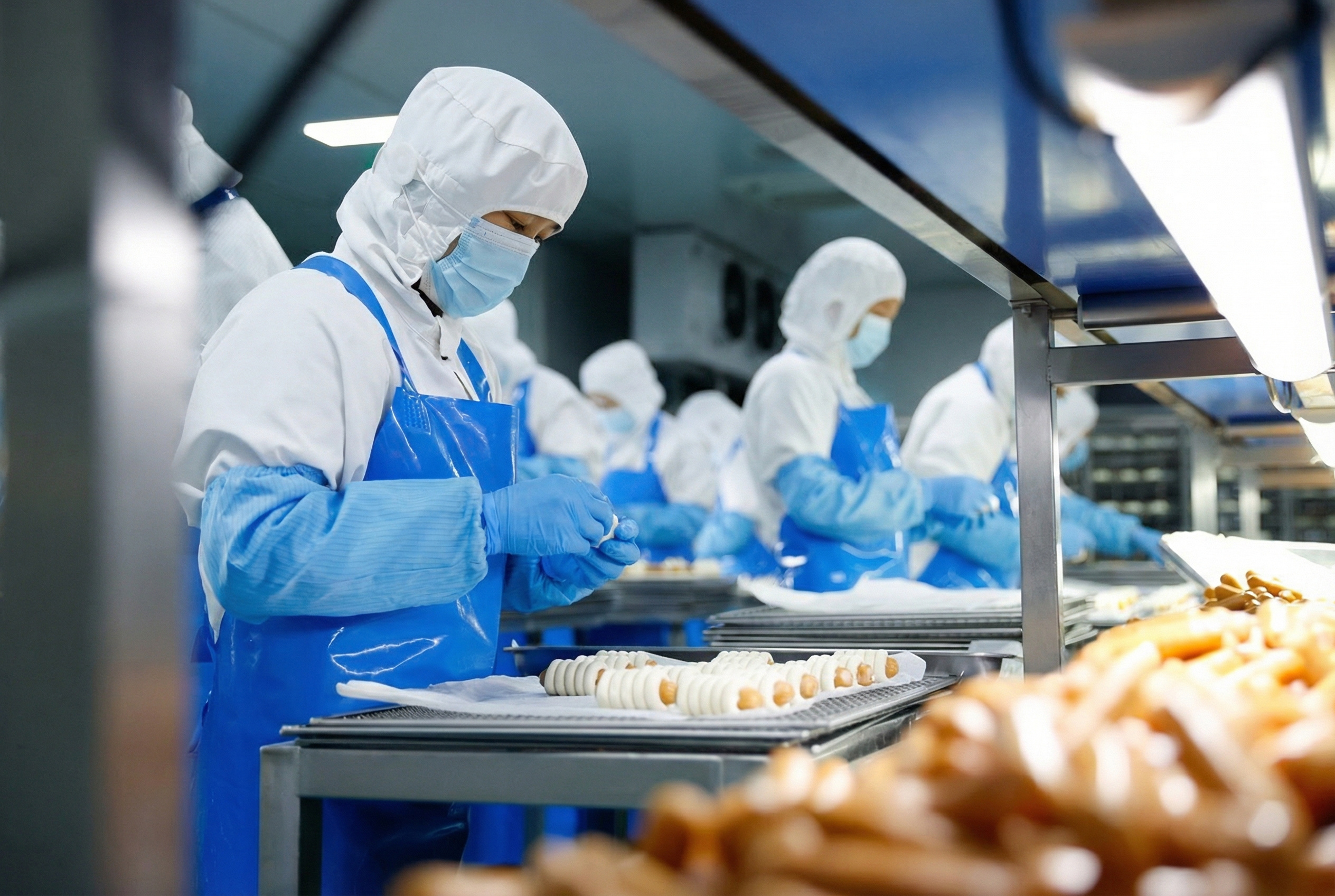 工人们身着专业工作服,在洁净的环境中有序忙碌。