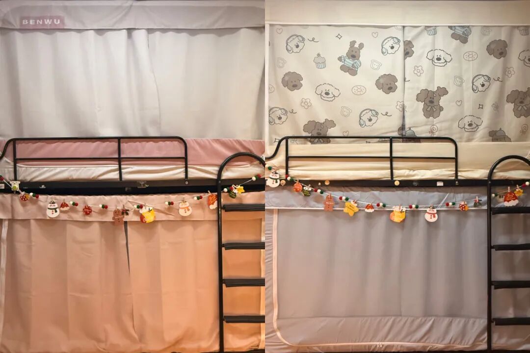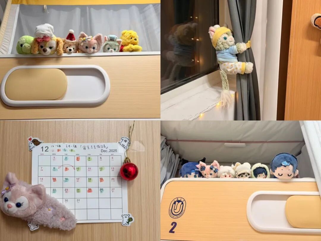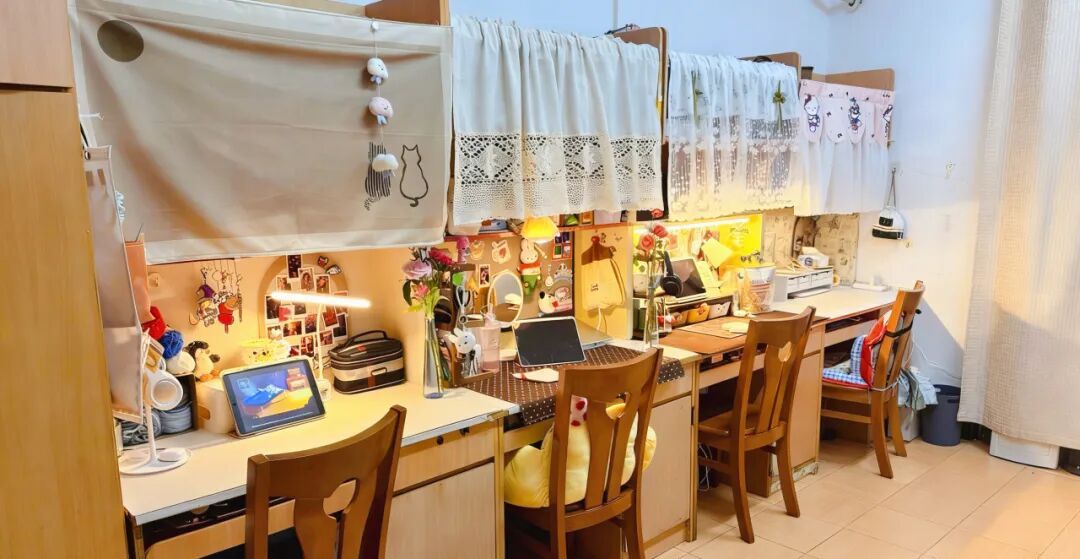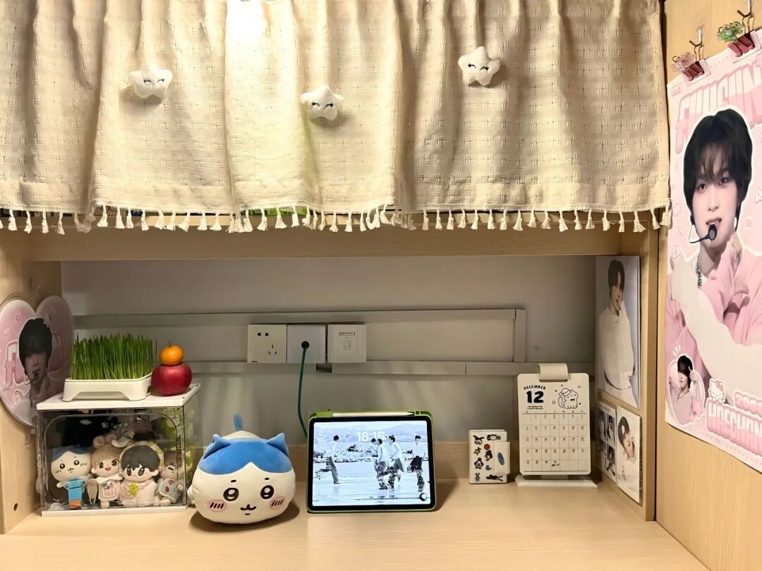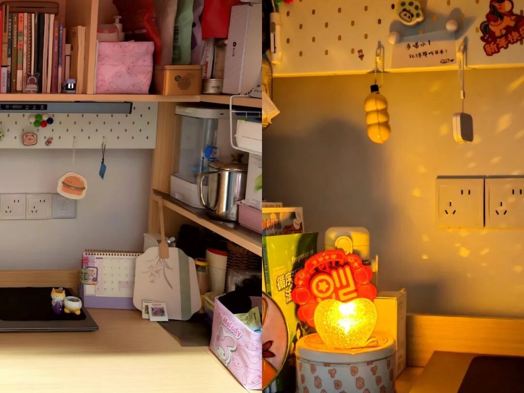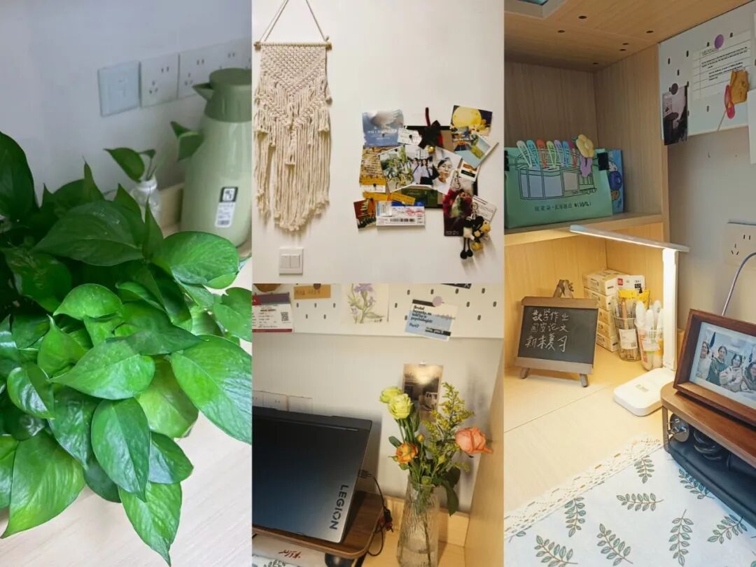 最触动的是看着空架子一点点被帘子、灯光和手作物填满的过程。我们一起挑选布料、拼豆、整理收纳,原本单调的宿舍渐渐有了温度。现在,拉上帘子就能沉浸在自己的小世界里,打开灯又是共享的温暖光景。这种“集体中的独处”让我们既能专注学业,又能随时感受到彼此的陪伴。原来,用心打理的不仅是空间,更是读研时光里一份可贵的安宁。