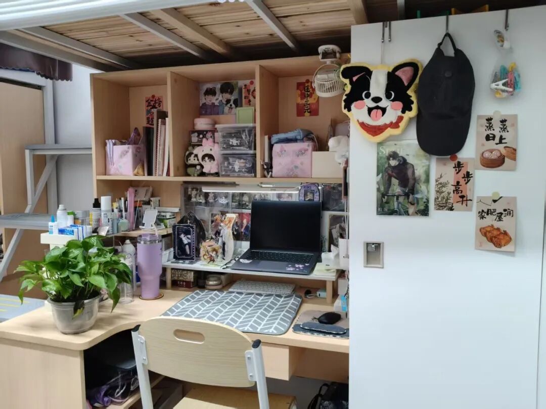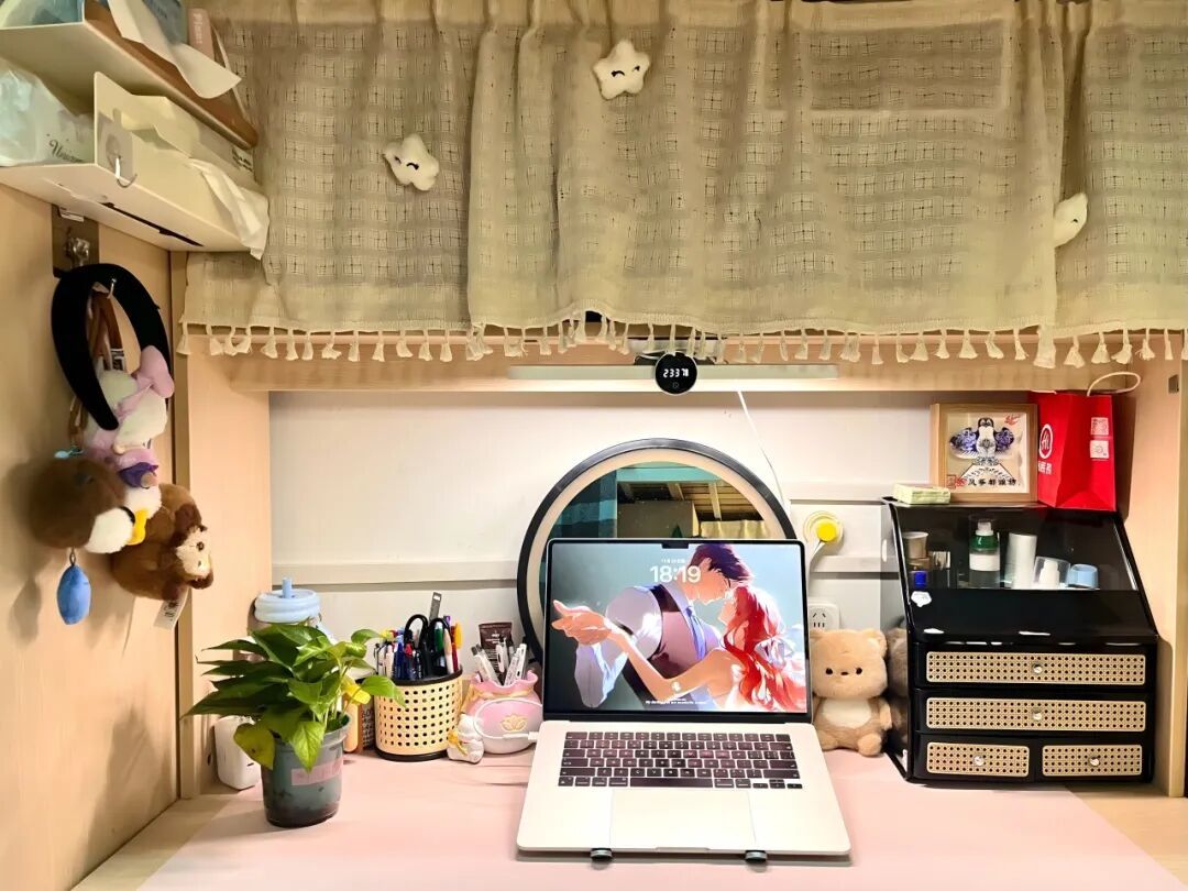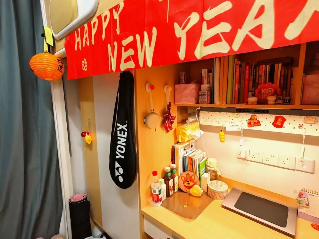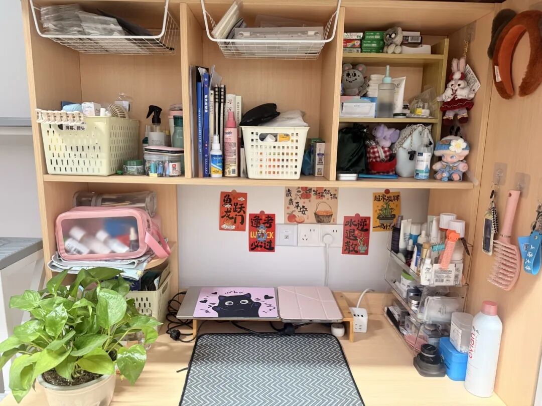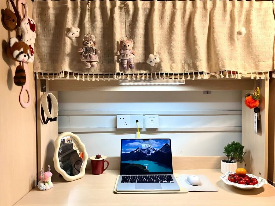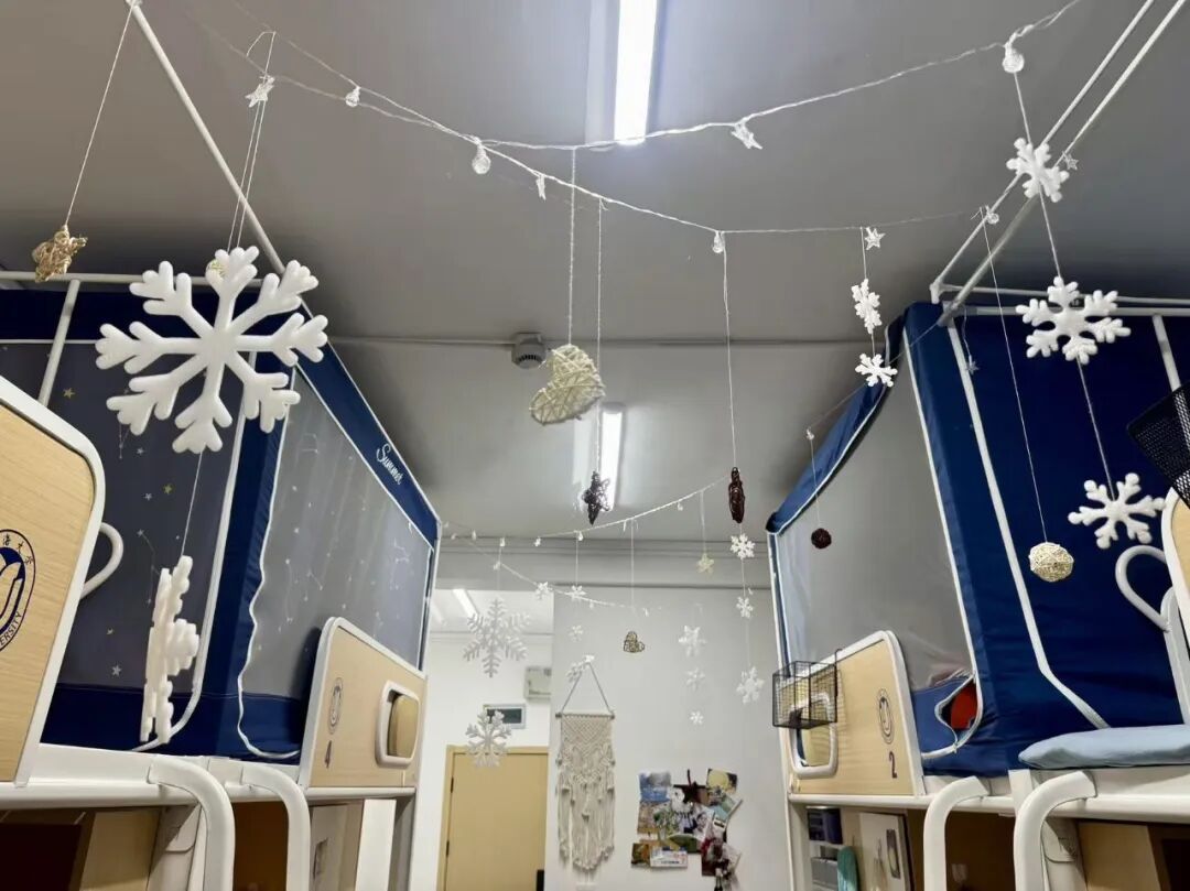 最触动的是看着空架子一点点被帘子、灯光和手作物填满的过程。我们一起挑选布料、拼豆、整理收纳,原本单调的宿舍渐渐有了温度。现在,拉上帘子就能沉浸在自己的小世界里,打开灯又是共享的温暖光景。这种“集体中的独处”让我们既能专注学业,又能随时感受到彼此的陪伴。原来,用心打理的不仅是空间,更是读研时光里一份可贵的安宁。