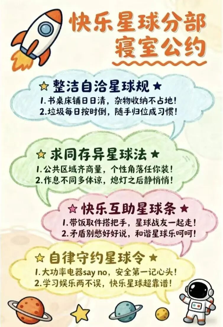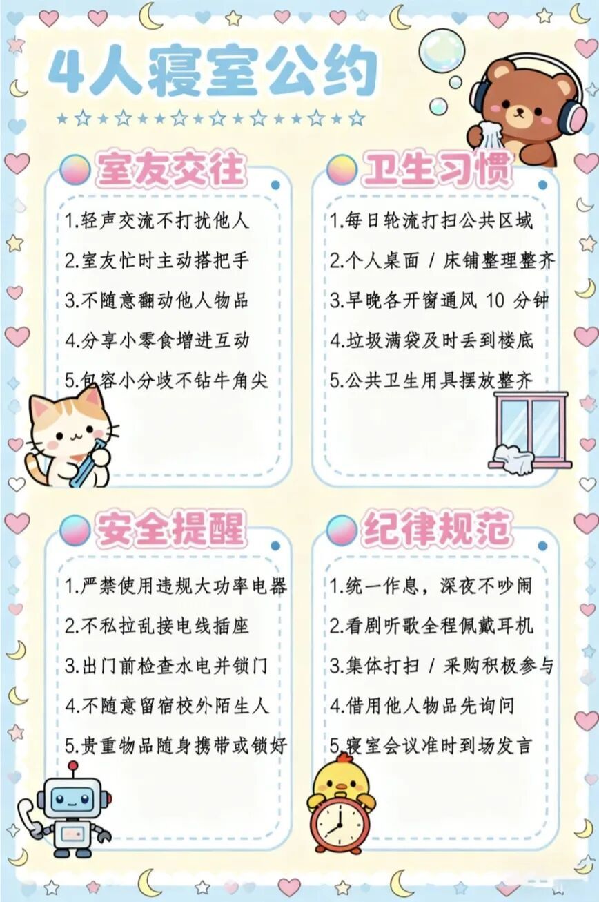在整洁与美感之外,真正让一间寝室成为“家”的,往往是一份用心书写的宿舍公约。它不只是贴在墙上的几行字,更是寝室成员彼此尊重、协商与承诺的见证——关于作息的默契、卫生的分工、情绪的包容,甚至深夜的“共享规则”。