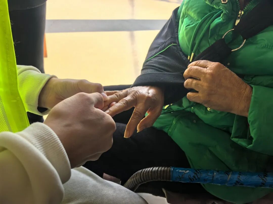 “冬天手容易干裂,我们给您涂点护手霜,按摩一下促进血液循环。”另一名志愿者小李一边说着,一边将温热的护手霜轻轻涂抹在华奶奶的手上,缓慢按摩着每一根手指。