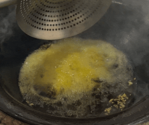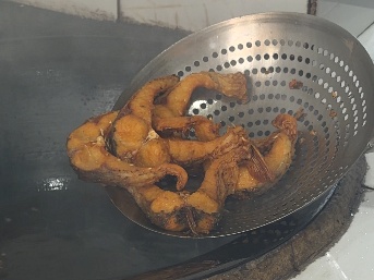 起油锅,将腌制的鱼块高温快炸至表面金黄微硬,定型锁水。捞出鱼块,冷却后进行复炸,鱼皮急速脱水,变得深褐、酥脆、硬挺,而内里依旧保持嫩度。