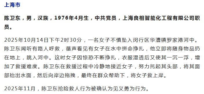 1月12日,中央政法委发布2025年第四季度见义勇为勇士榜,来自闵行的上海良相智能化工程有限公司副总裁陈卫东位列其中。 见义勇为勇士榜发布活动由中央政法委主办,中华见义勇为基金会承办。2022年9月以来,已发布12次见义勇为勇士榜,共有657位见义勇为勇士获得通报表扬奖励。