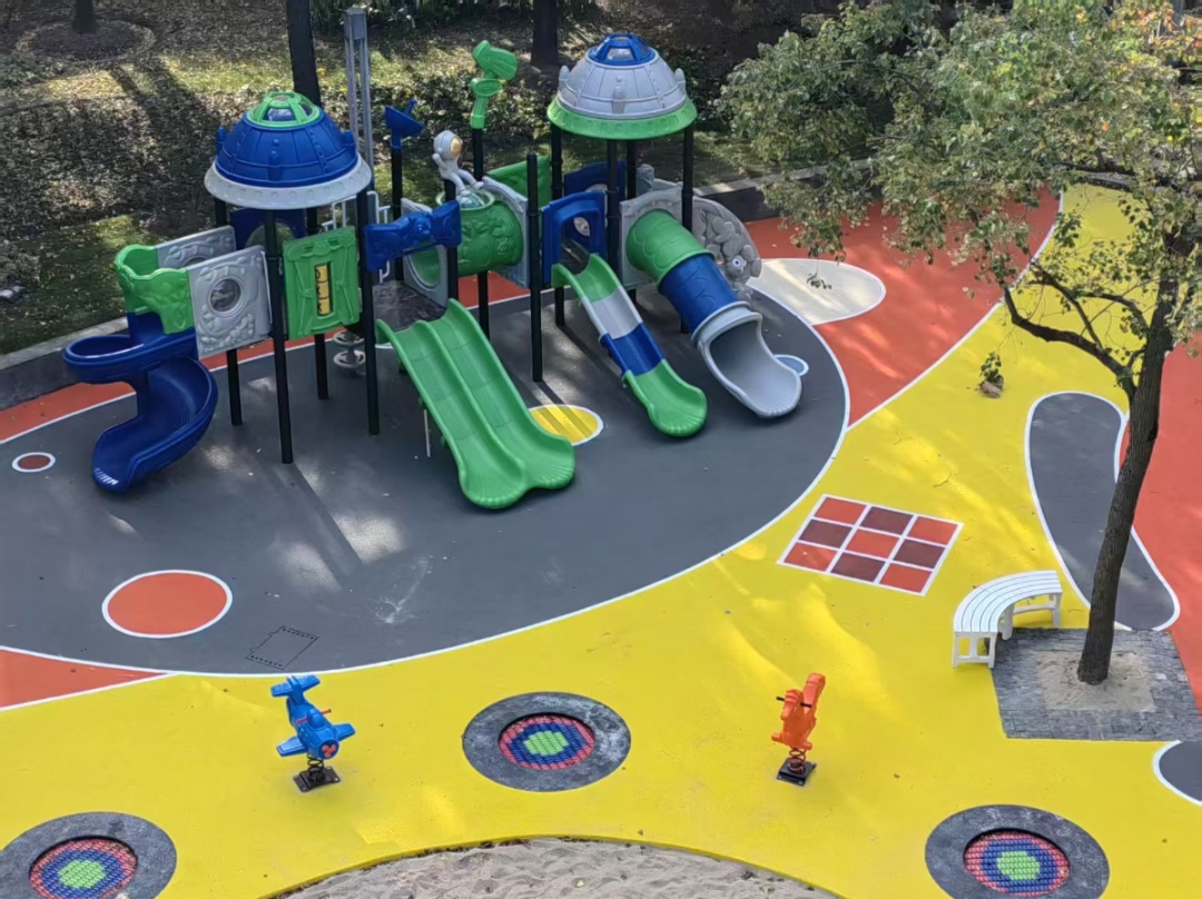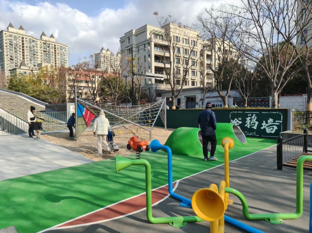 作为“体育+绿化”融合发展的鲜活范本,园区打破“运动设施与绿地割裂”的局限,让运动场景与滨江生态景观无缝衔接——孩子们在奔跑嬉戏中能闻见草木清香,家长在看护等候时可欣赏江景绿意,真正实现“在自然中运动,在运动中亲自然”。幼龄区(3—6岁)配备摇摇马、传声筒、亲子秋千等设施,兼顾安全性与趣味性;低龄区(6—14岁)设置攀爬架、攀岩抓手、海盗船等,助力孩子锤炼体能、开启运动启蒙;趣味智能区则融入打击乐器、涂鸦墙、益智轨道拼图等,让孩子在“玩中学、学中乐”。更周全的是,无障碍通道、童车停放区、带遮阳设施的休息看护区等配套一应俱全,完善的服务链条让“体育+绿化”的融合效应更全面、更暖心。
