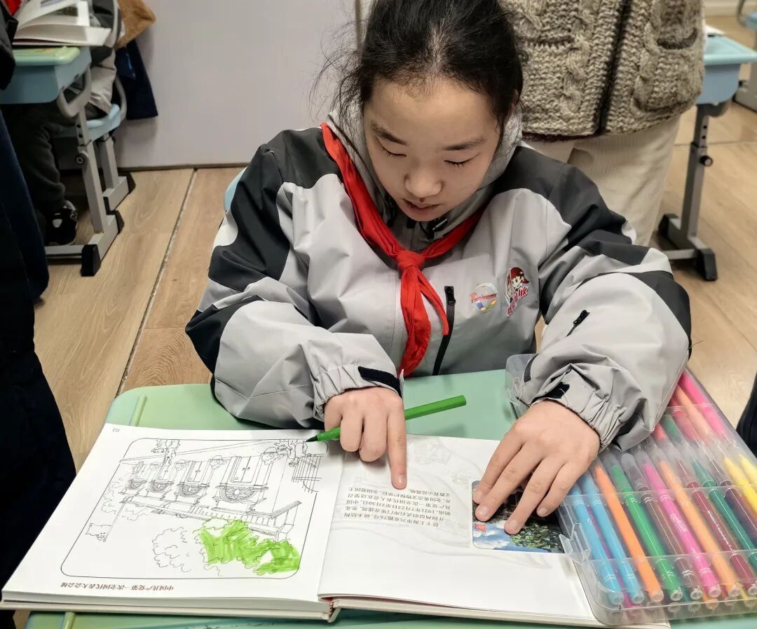 当天下午的教室里,只有画笔划过纸面的沙沙声,和偶尔用手语交流的轻柔动作,却令人格外触动。孩子们在涂色时展现出了不同的个性与思考。有的严谨地参照图片“还原历史”,有人则放飞想象,为建筑点缀上自己心中的色彩。一幅幅作品呈现出的,是党史学习的成果,更是孩子们情感与审美的表达。