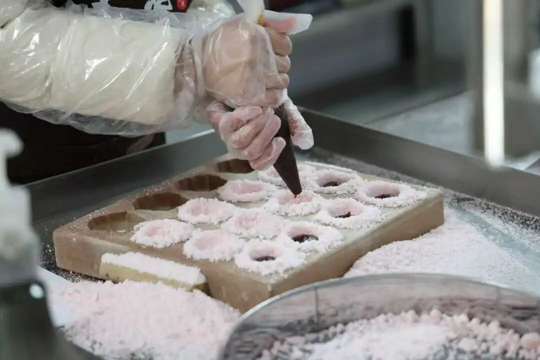 一大早,走进丰悦来糕点的制作车间,浓郁的米香与清甜的馅料香扑面而来,糕点师傅们正各司其职地忙碌着,手中的筛网轻轻晃动,将颗粒饱满的米粉细细筛滤。