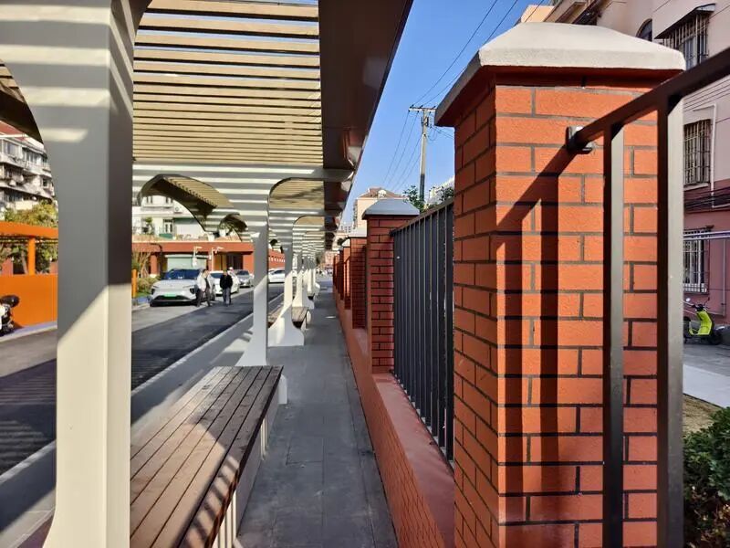 通道南侧的风雨连廊也是“五八通道”焕新改造的一个突出亮点。它不仅非常美观,还具有挡风遮雨和夏天为居民遮挡强烈阳光的功能,非常实用。根据人大代表对“五八通道”改造方案的建议,这条风雨连廊将来还将进一步提升,彰显“百年吴淞”厚重的人文底蕴,让居民不忘自己脚下这片土地的“乡愁”。