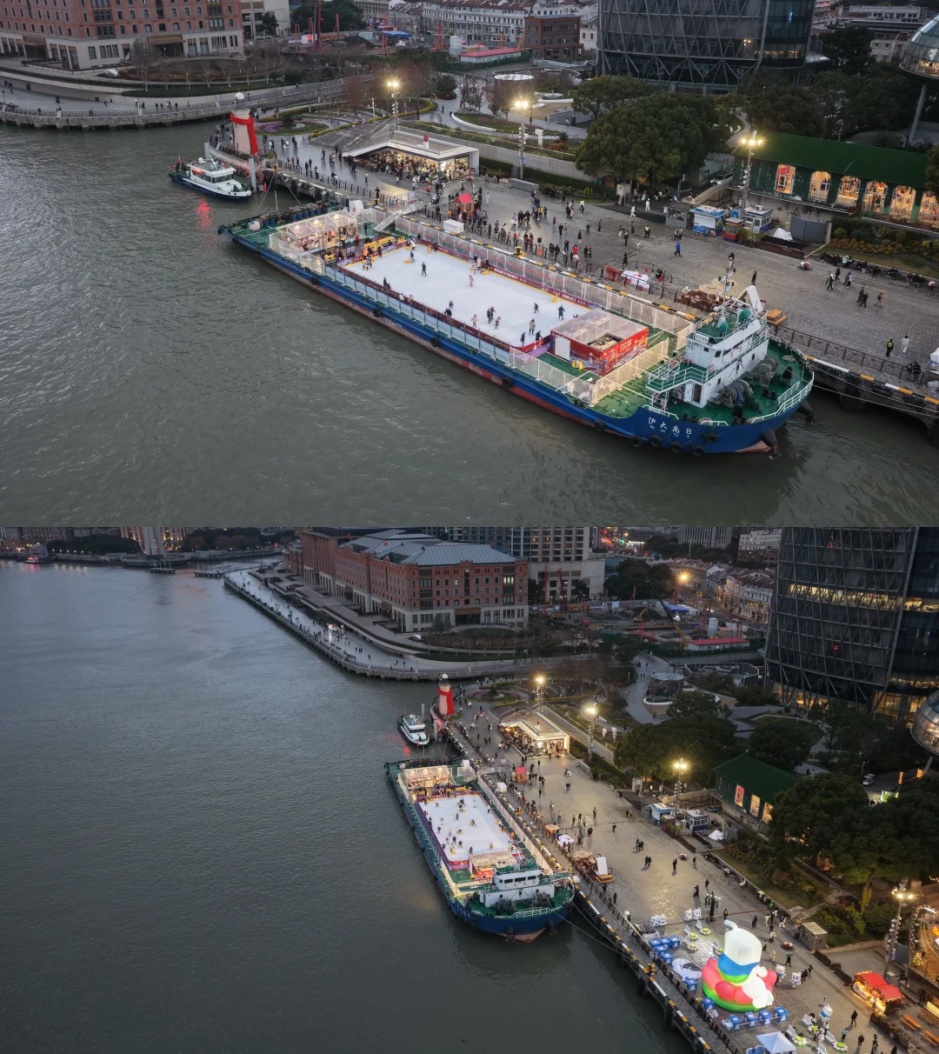 “2026北外滩江畔冰雪季”以“冰雪”与“暖冬”为核心概念,将沪上首个浦江冰场搬进北外滩城市天际线。