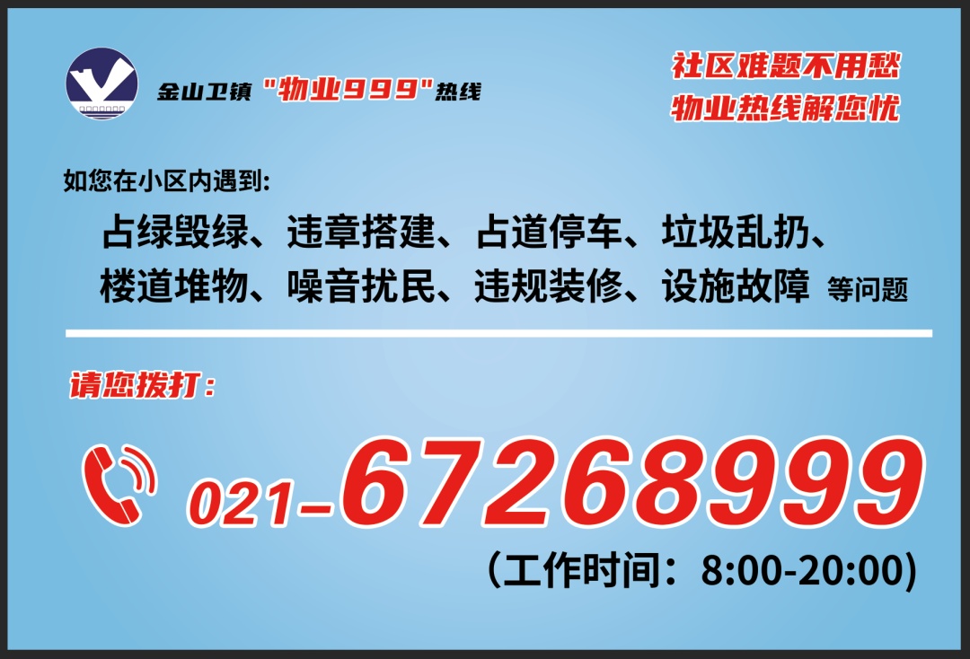 近段时间,金山卫镇的居民们有了一个全新的问题诉求反映渠道——“物业999”服务热线(021-67268999)。