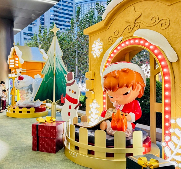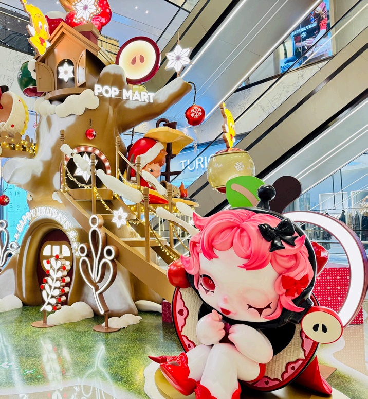 Plaza 66 has partnered with luxury brand Goyard on an outdoor installation featuring a large mechanical travel trunk with moving elements. At JC Plaza, a collaboration with Pop Mart has brought in a themed exhibition featuring characters such as Labubu and Dimoo, targeting younger visitors.