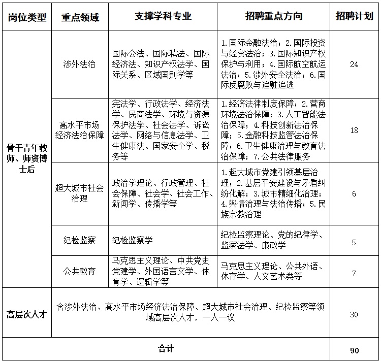 招聘专业涵盖法学、政治学、管理学等学科门类,重点面向涉外法治、高水平市场经济法治保障、超大城市社会治理三大领域。