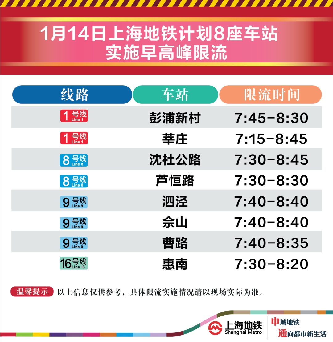 【编辑】马小播1月14日,上海地铁早高峰限流措施将继续实施,届时将有8座地铁站早高峰计划限流。
