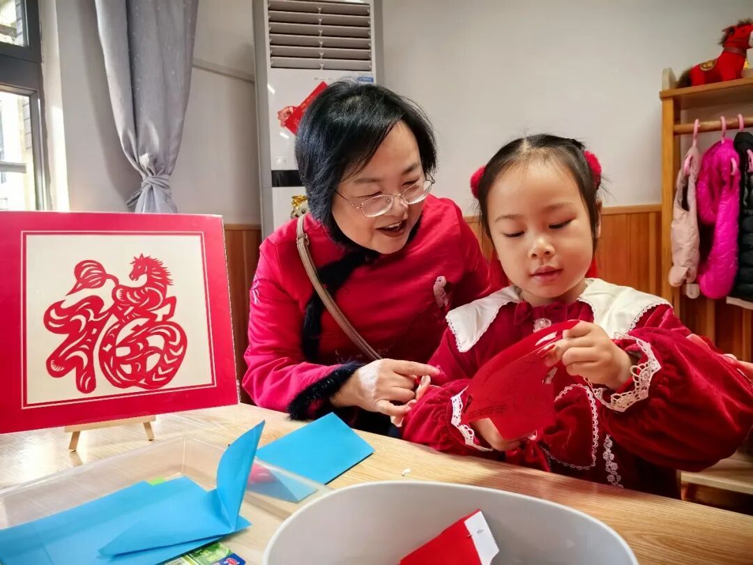 除班级内的九大年俗主题乐园外,永丰街道社区党群服务中心非遗项目组的手艺人也走进幼儿园,现场展示马年专属面人、糖画、草编等传统技艺,吸引孩子们驻足观看。大(4)班幼儿项悠然拉着奶奶楼上楼下尽情体验:“今天的幼儿园超热闹,有好多好吃的、好玩的,我最喜欢包汤圆!”大(5)班张逸轩小朋友兴奋地展示作品:“这是我剪的窗花,这是我写的福字!我还知道了好多年俗!”