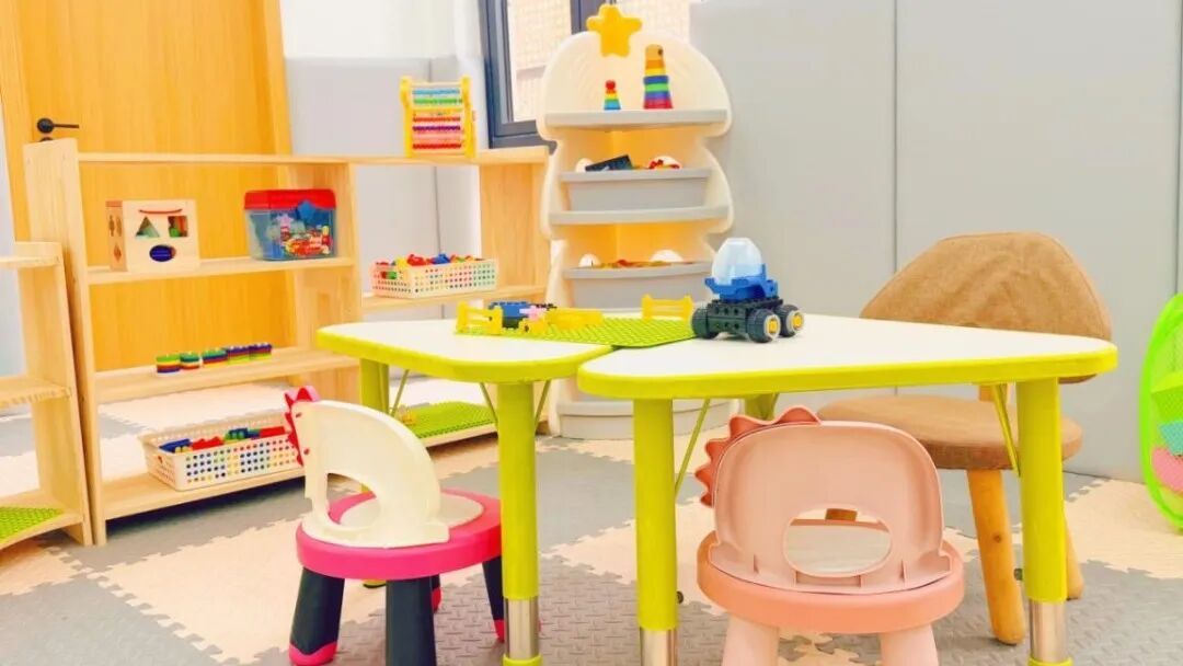 设计细节:台面边缘做圆弧处理,防止磕碰;墙面张贴色彩明快的认知挂图(数字、字母、动物、水果等),辅助益智游戏开展。
