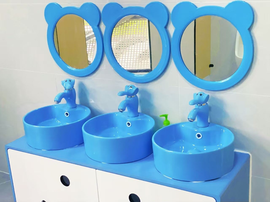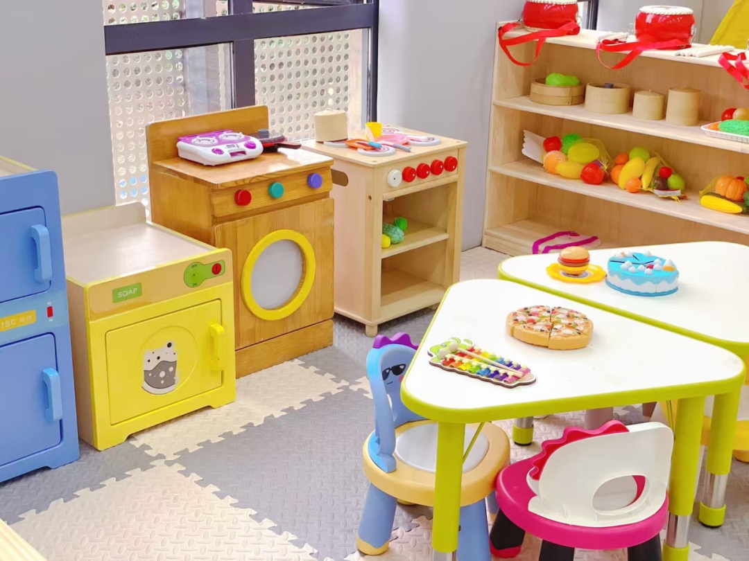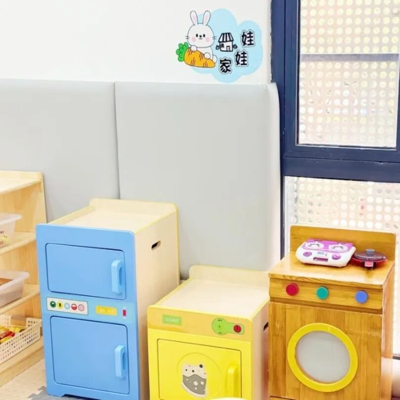 设施配置:迷你生活场景区(小厨房玩具套装:仿真灶台、餐具、蔬果模型;迷你梳妆台:安全梳子、镜子、小毛巾;自理训练台:扣扣子、拉拉链、系鞋带的练习布偶)、儿童洗手池(高度60厘米,配备感应水龙头、儿童专用洗手液)、小型晾晒架(用于挂放宝贝折叠的小毛巾、小衣物)。