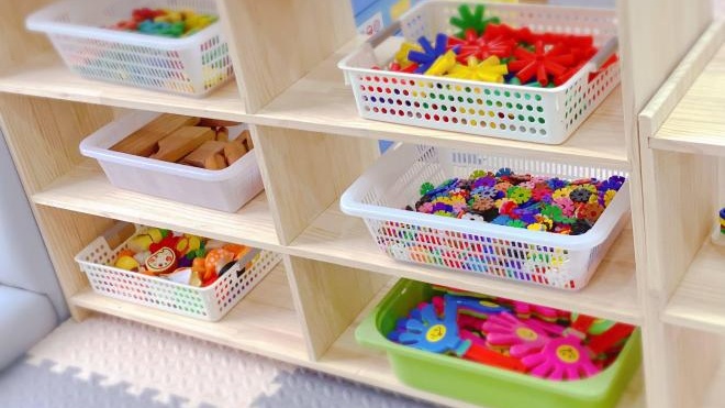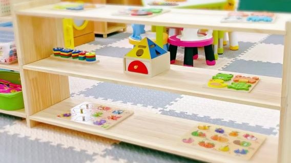 设施配置:分龄化益智玩具区设触觉感知球、形状配对盒;串珠玩具、数字认知板;拼图、分类排序盒、简单迷宫板、操作台面(低矮儿童桌,高度适配不同年龄段宝贝)。