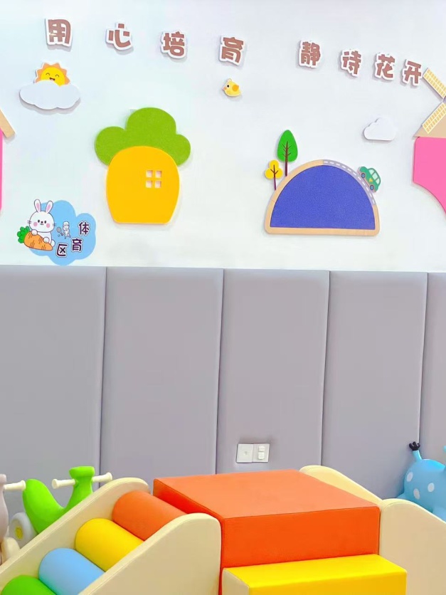 整体环境采用环保无毒材料,墙面做软包处理,地面铺设防滑静音地垫,避免宝贝磕碰受伤;室内光线充足柔和,营造舒适的体感环境。