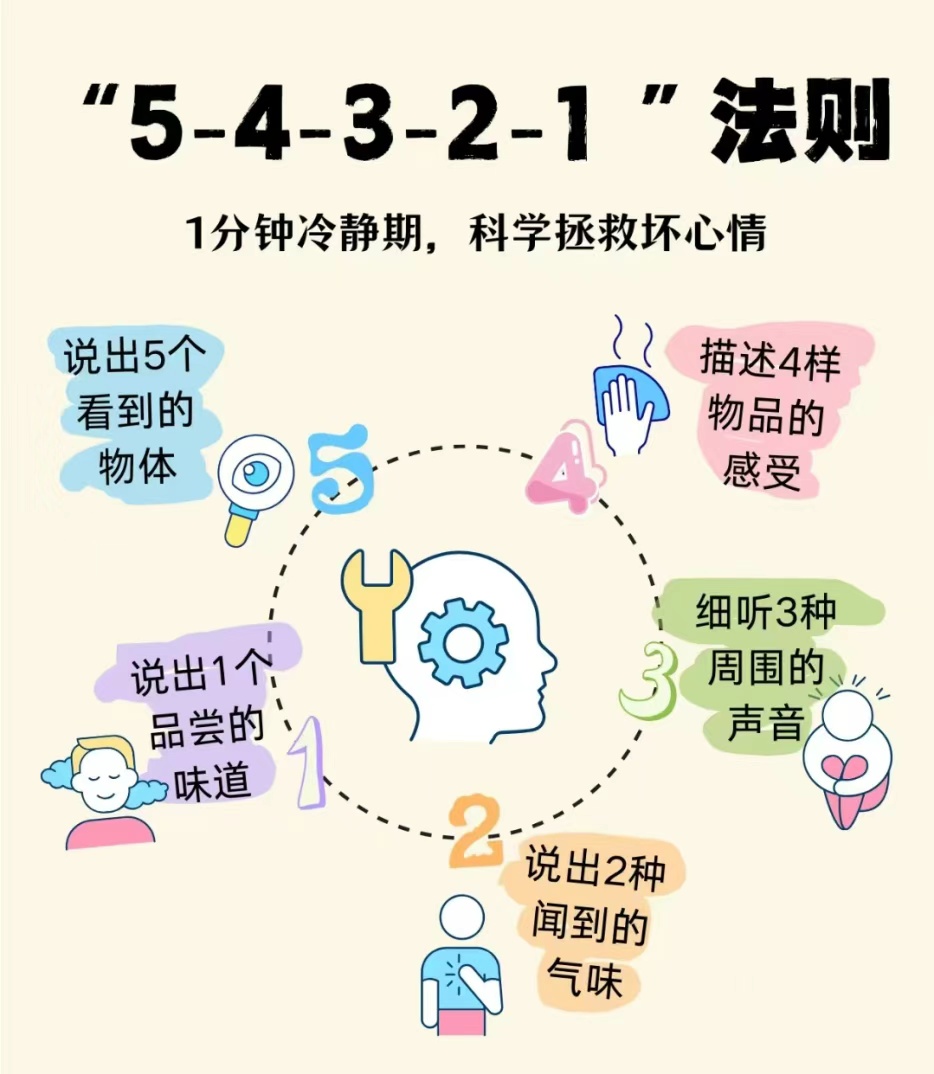 当我们感到焦虑时,一些对未来的可怕想象很容易攻占我们的大脑,比如“考砸了怎么办”“题目写不出来怎么办”等等。这是一种非常普遍的情绪体验,而情绪着陆技术可以通过调动感官,把注意力重新拉回当下安全的现实,比起尚不可知的未来,我们更要把握能够改变的当下。情绪着陆也可以叫做“5-4-3-2-1感官稳定法”,我们只需要小小的五步就能拉回注意力!