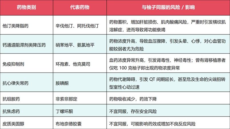 并非所有药物都会受影响,但以下几类常用药与柚子同服风险极高: