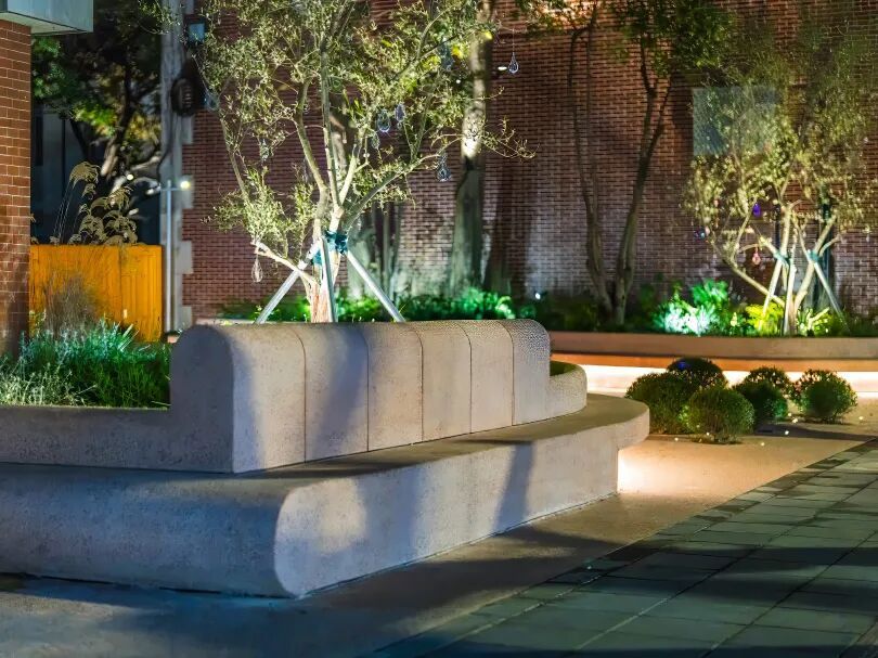 拆除实体围栏,采用绿篱、低矮花坛等生态柔性的方式界定空间,实现视觉与步行的双重贯通,将绿地无缝衔接至城市街道网络。增设景观座椅,为周边居民及访客提供午休放松、社交会友的舒适场所。