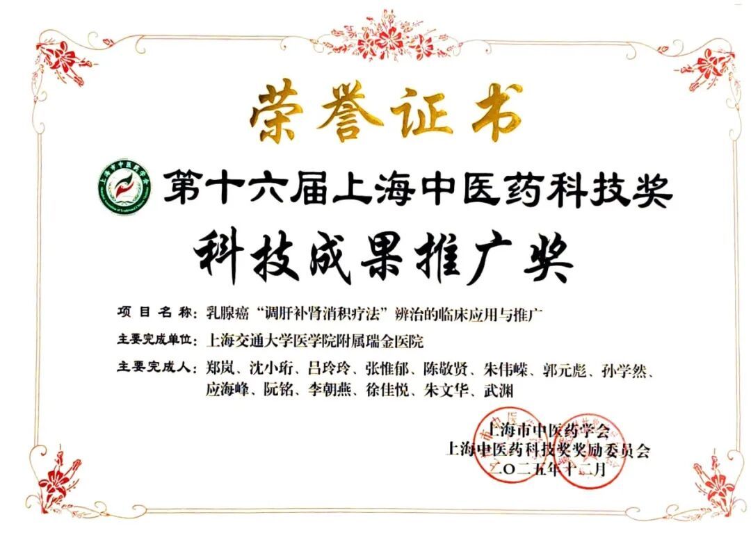 近日,瑞金医院中医科郑岚主任团队传承上海市名中医沈小珩教授“调肝补肾消积疗法”的相关研究成果《乳腺癌“调肝补肾消积疗法”辨治的临床应用与推广》,荣获2025年第十六届上海中医药科技奖科技成果推广奖。团队深耕中西医结合领域,精心构建心身同治的乳腺癌诊疗方案,成功逆转了乳腺癌的病情发展与转归,为患者带来新希望。