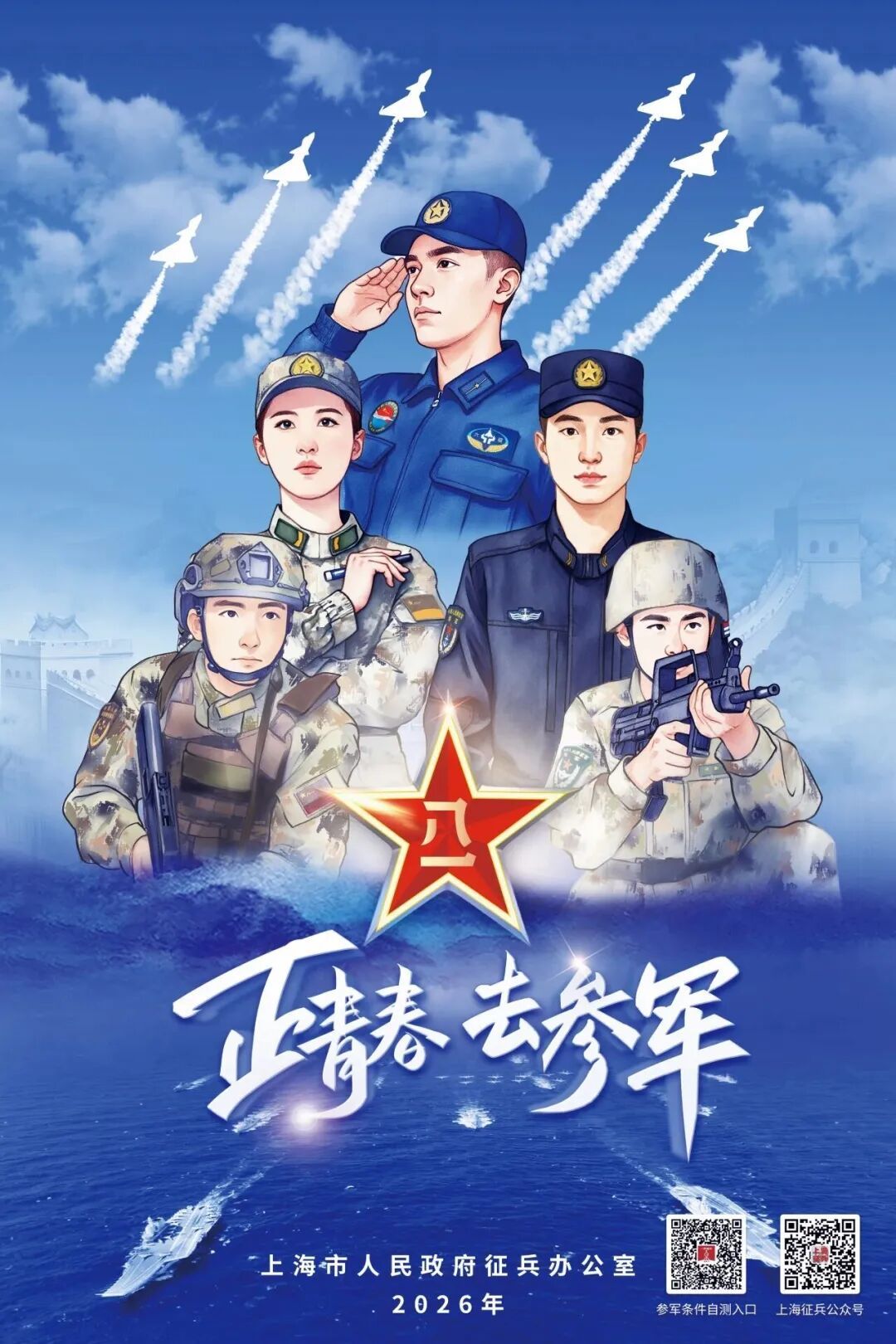 2026年上海市征兵宣传工作全面展开,征兵应征报名火热进行中!应征报名、政策咨询可登录“全国征兵网”(网址:https://www.gfbzb.gov.cn);上海市征兵政策查询可访问“上海征兵”微信公众号。
