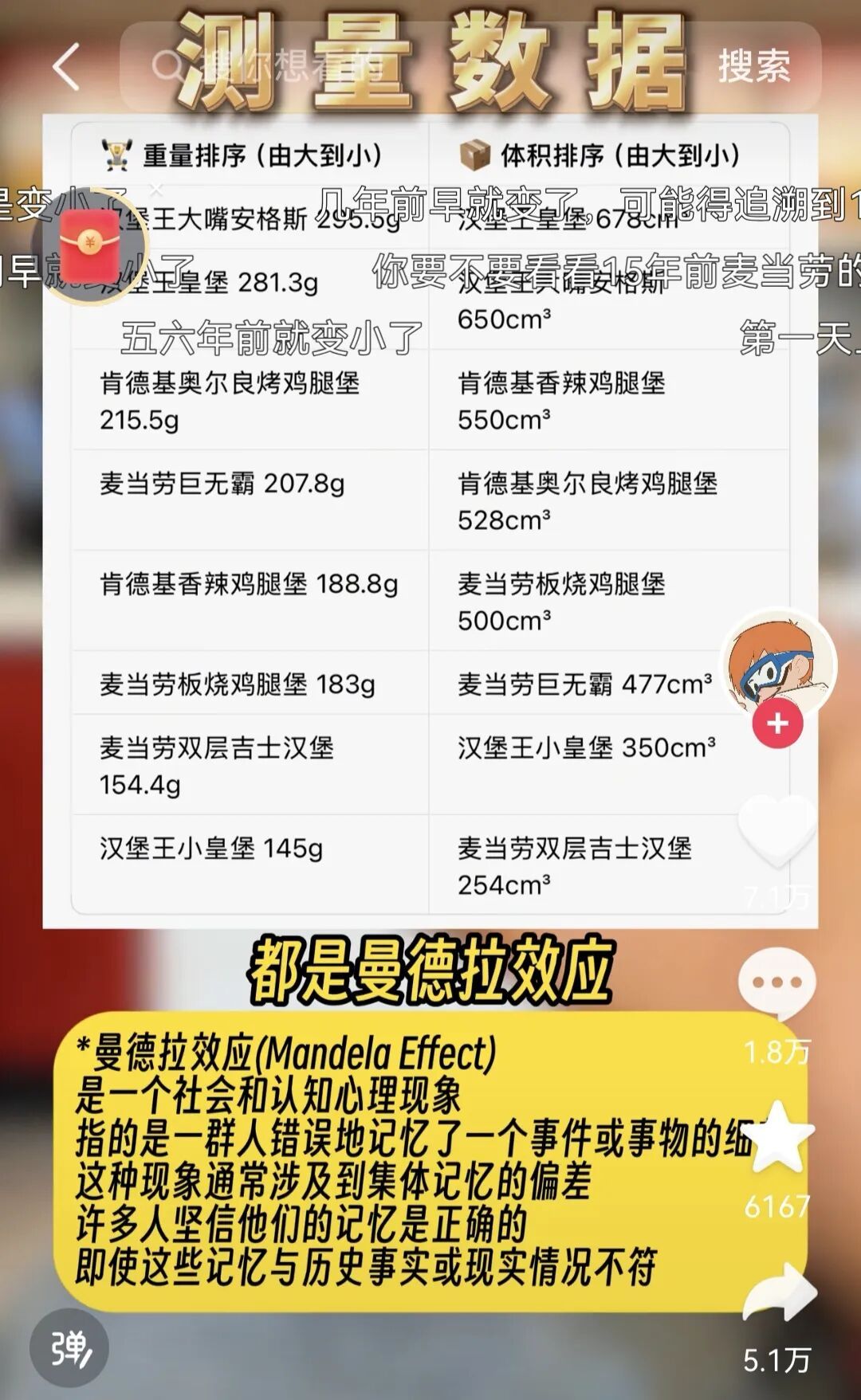 也有博主通过测量体积和重量的方式,认为麦当劳汉堡并没有变小,而是一种“曼德拉效应”。