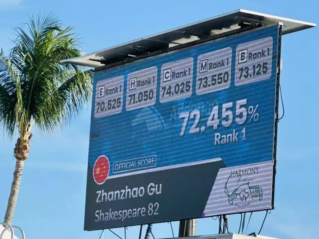 1月8日,在圣乔治比赛中,顾展兆以66.500%的成绩获得第五名;1月9日,在中一级比赛中,他以69.000%的成绩斩获亚军;1月11日,在中一级自由演绎的比赛中,他与马匹配合默契,最终以72.455%的高分夺得冠军!