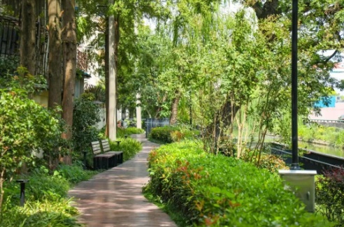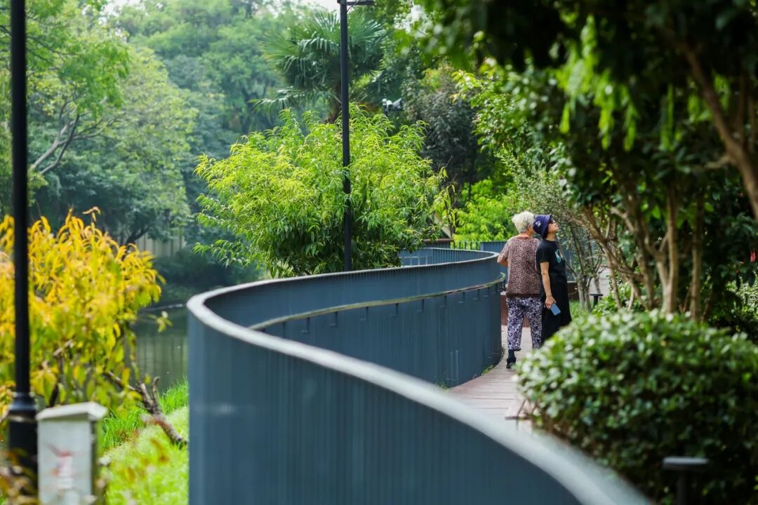 沿着梅陇港河畔漫步,波光粼粼的河面与沿岸葱郁绿植相映成趣,全长约2360米的梅陇港绿道,成了徐汇南部一道亮眼的滨水风景线。