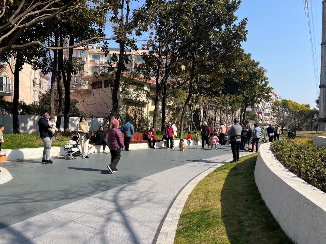 绿道全线采用平缓坡道与防滑铺装,轮椅、婴儿车通行毫无阻碍,无障碍设计藏满贴心细节。更让人惊喜的是,步道保留了部分老上海特色的鹅卵石花街铺地,升级改造为特色康体步道,既留住了老场地的专属记忆,又为日常锻炼添了新乐趣,真正实现“旧貌换新颜”。