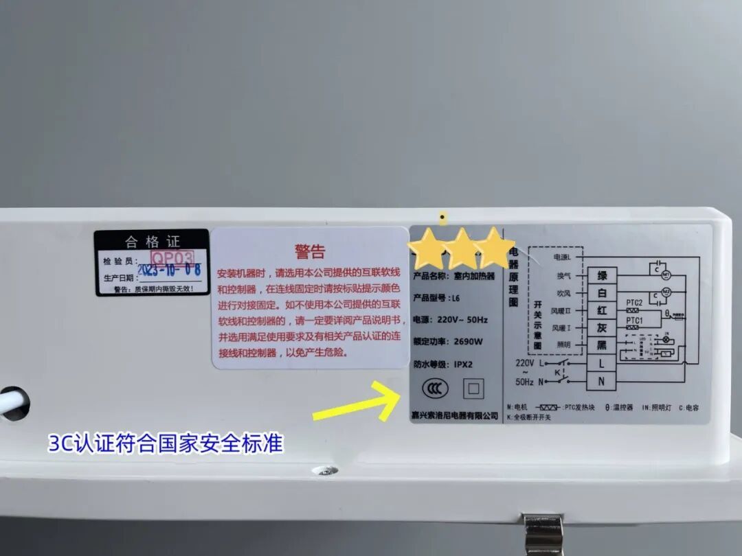 查看产品标识 购买电取暖器时,需要认真查看商品包装和产品说明,一看是否有商品名称、生产企业名称,二看是否有产品出厂检验合格证、执行标准代号,三看规格、型号、功率,四看有哪些注意事项。最重要的是,要认准国家强制性认证“ccc”标志(3c标志)。没有这个标志就不是正规产品,千万不能买!