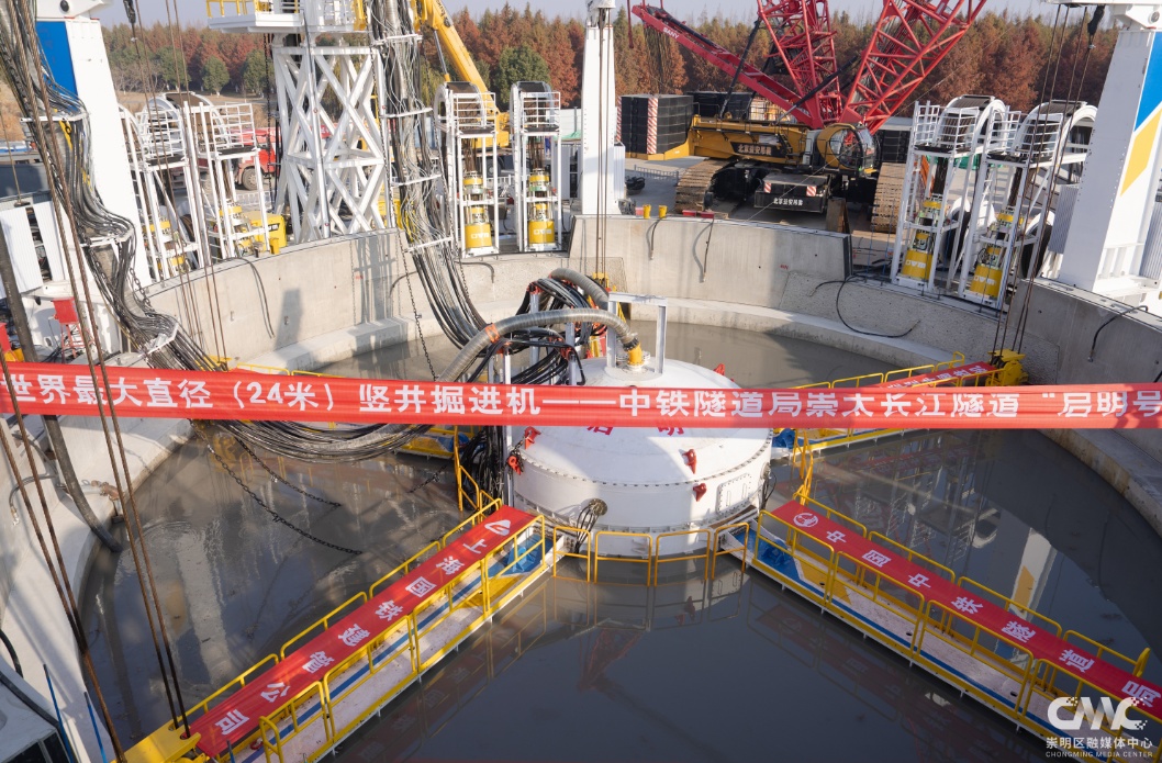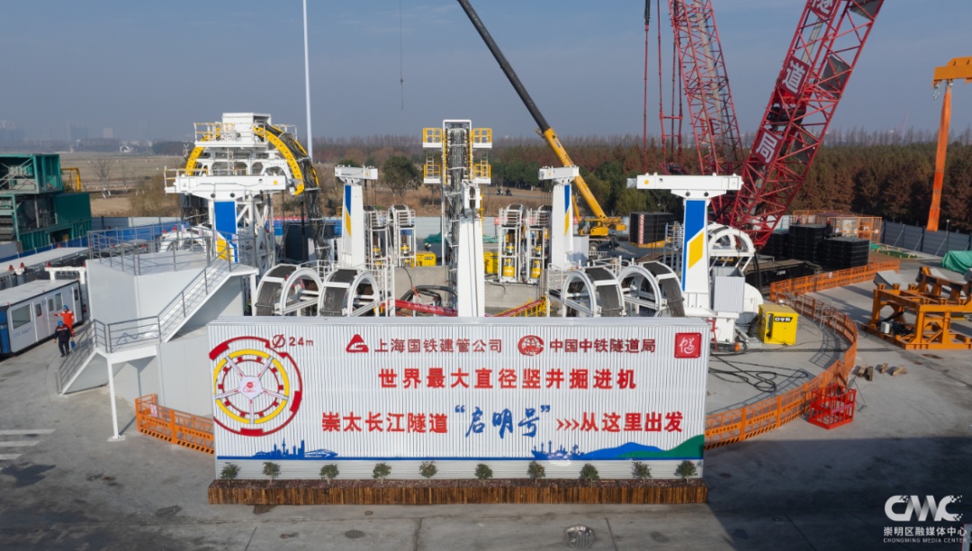 全长14.25千米的沪渝蓉高铁崇太长江隧道连接上海崇明与江苏太仓,从崇明庙镇始发的隧道盾构“领航号”距离太仓已经越来越近。今天(1月13日)上午,位于太仓市浮桥镇,承担“领航号”接收与再始发的2号竖井迎来新进展,世界最大直径竖向掘进机“启明号”从这里顺利始发。