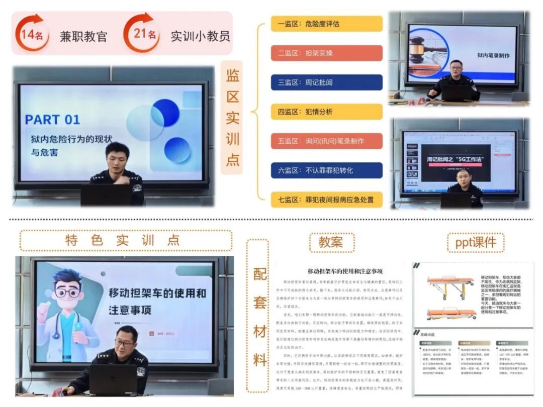分中心以实训阵地标准化为牵引,全面夯实培训保障。在固化14名监狱兼职教官基础上,统筹监区、科室资源,再遴选21名业务骨干担任“小教员”,实现科室与监区双向联动。紧扣功能监区特色,建成一批“四随”实训点和示范样板,形成“菜单式”项目矩阵:应急救护开设担架实操专班,教育转化推出周记批阅规范课堂;配套统一PPT、教案、实操手册,做到“可学、可感、可落地”,精准匹配岗位差异,放大示范点辐射效应,带动全监培训质量整体跃升。