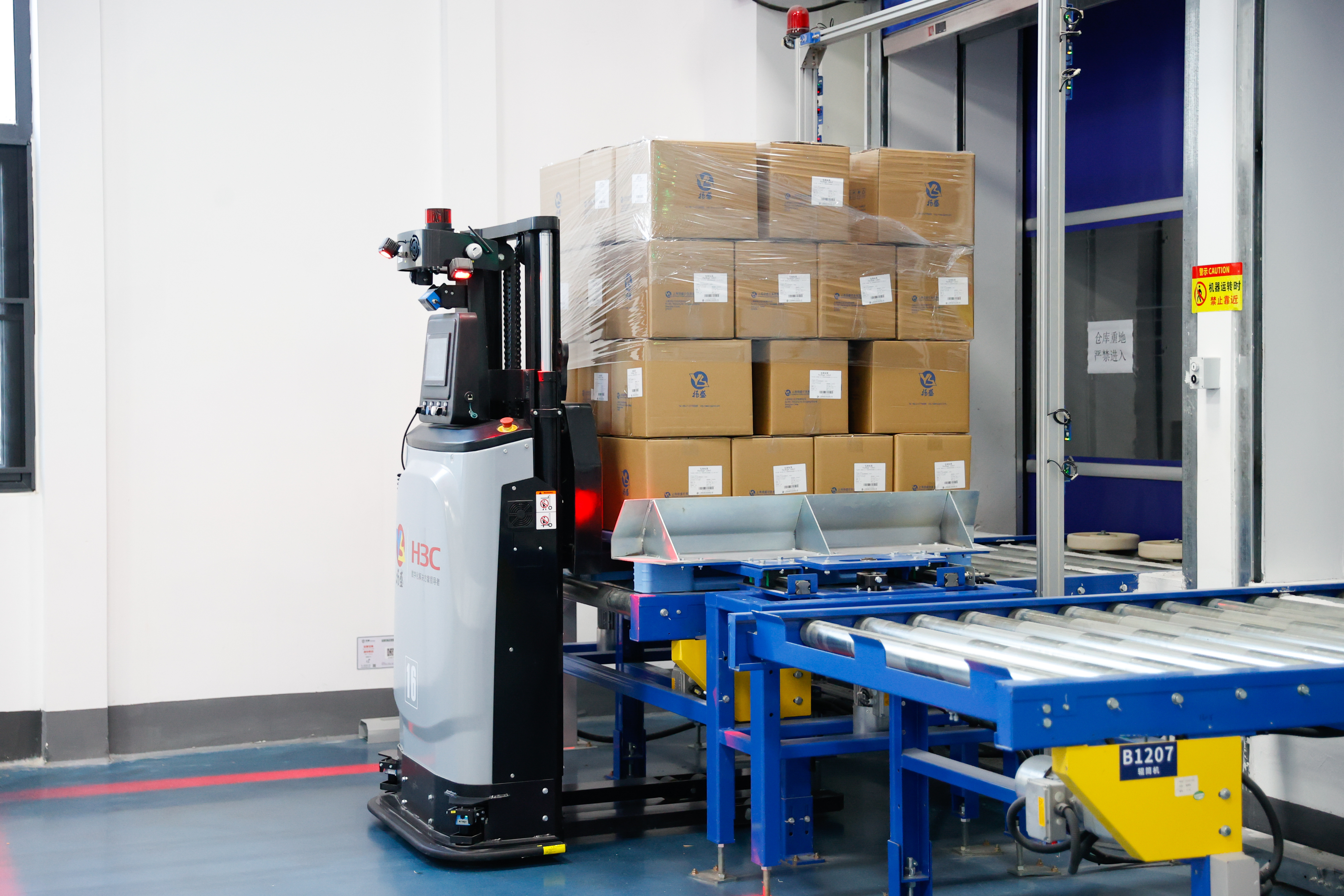 AGV小车运载成品进仓库。