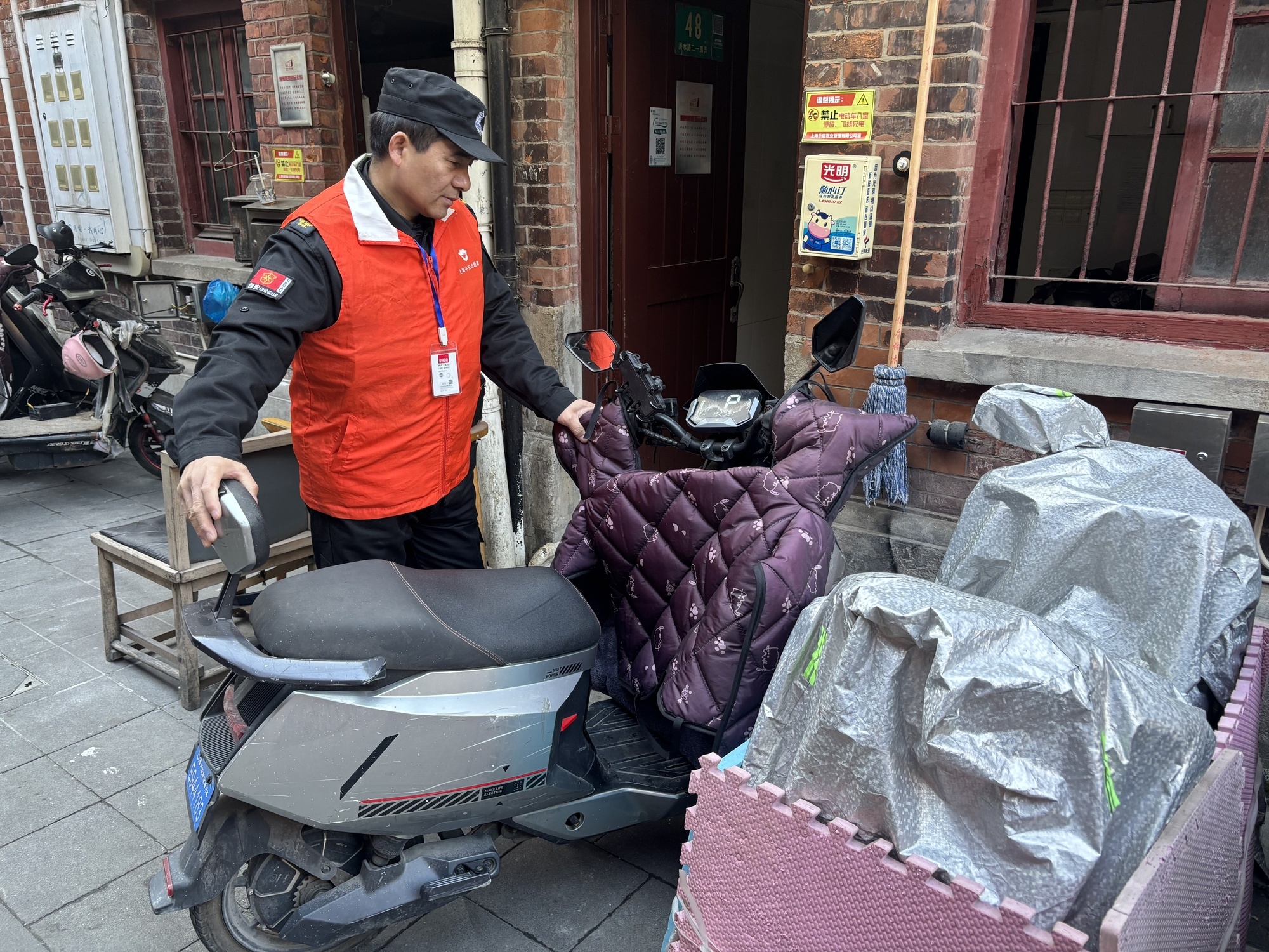 清晨的丰裕里弄堂,暖阳透过老洋房的梧桐枝丫洒下,街坊邻里们正开启日常的生活节奏,平安志愿者高照军也像往常一样,穿上橙色马甲在弄堂里巡查。
