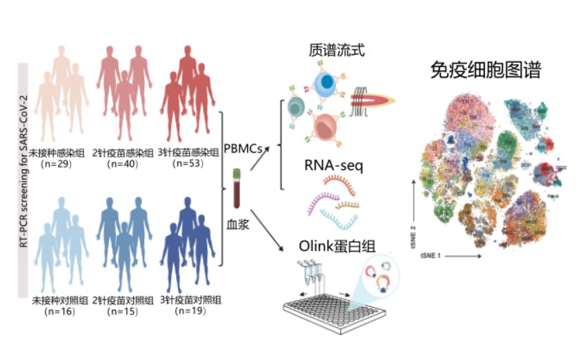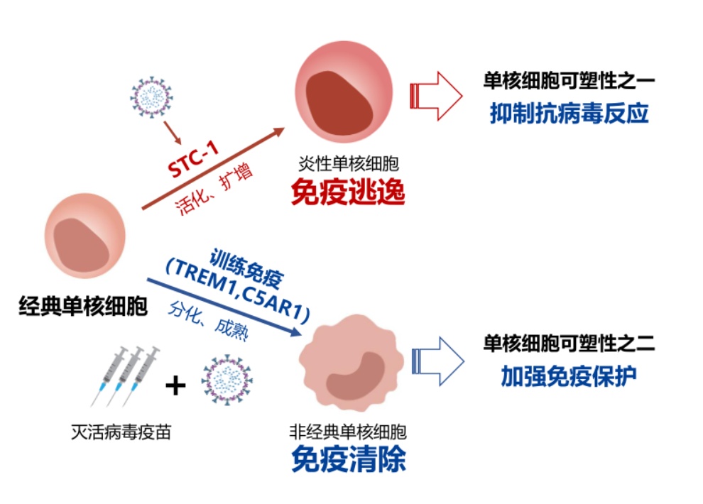 上海交通大学医学院附属瑞金医院研究团队整合质谱流式、转录组测序和血浆蛋白检测技术,发现加强免疫不仅能够促进Th1-like效应性记忆T细胞的极化,抑制致病性Treg的扩增,而且首次揭示加强免疫促进HLA-DRhigh经典单核细胞和非经典单核细胞的活化,并诱导单核细胞形成“训练免疫”特征,从而在突破感染早期快速触发单核细胞的活化与成熟,而非分化为髓源性抑制细胞(MDSCs),是启动免疫保护效应的核心事件。