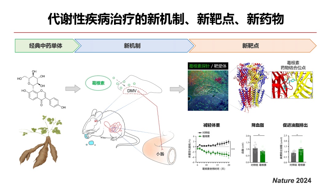 王卫庆教授团队阐明小肠油脂吸收的中枢调控机制,完善了营养吸收的知识体系,并发现迷走神经背核GABA受体可作为糖脂代谢调控的新靶点。通过药物筛选、分子探针、动物模型等策略,阐明葛根素调控迷走神经GABA受体的分子机制,为中药单体的现代化研究开辟了新范式。同时,临床发现葛根素具有降血压、降血糖等获益,为代谢性疾病的综合防治拓展了新思路。