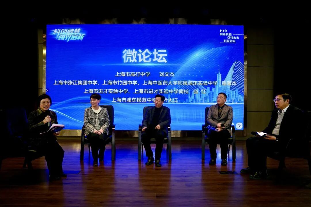 在活动的微论坛环节,浦东新区第三期名校长董君武基地成员——张军杰、盛红、亓大江及高行学区牵头校刘文杰校长展开了一场深度对话,共同探讨跨学科主题学习的价值、路径与挑战。论坛由浦东教育发展研究院教学研究指导部姚霞老师主持。