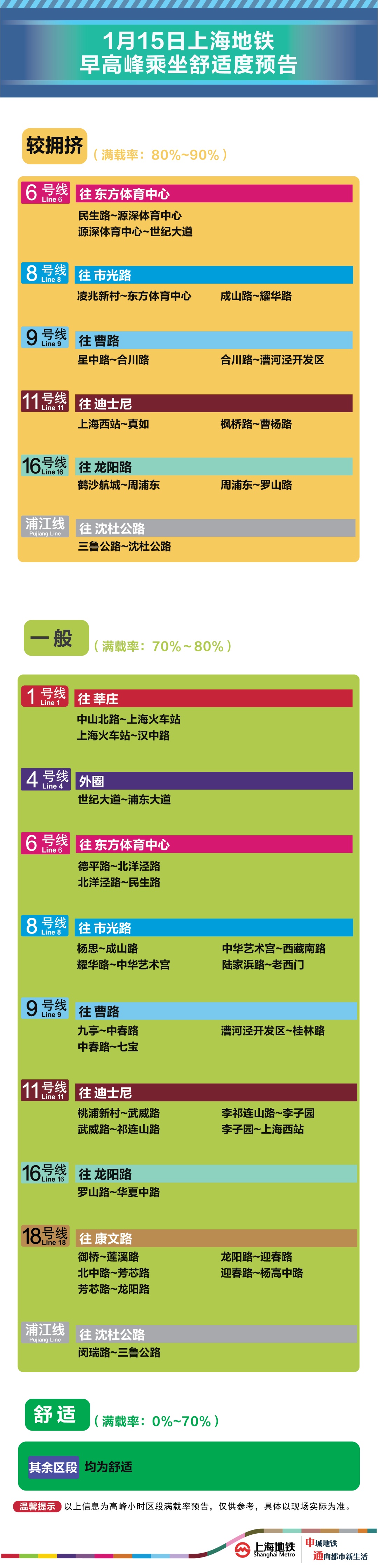 为提升上海地铁早高峰期间出行服务水平,提升乘客乘坐体验,上海地铁向乘客提供乘坐舒适度预告,方便乘客提前做好出行准备。
