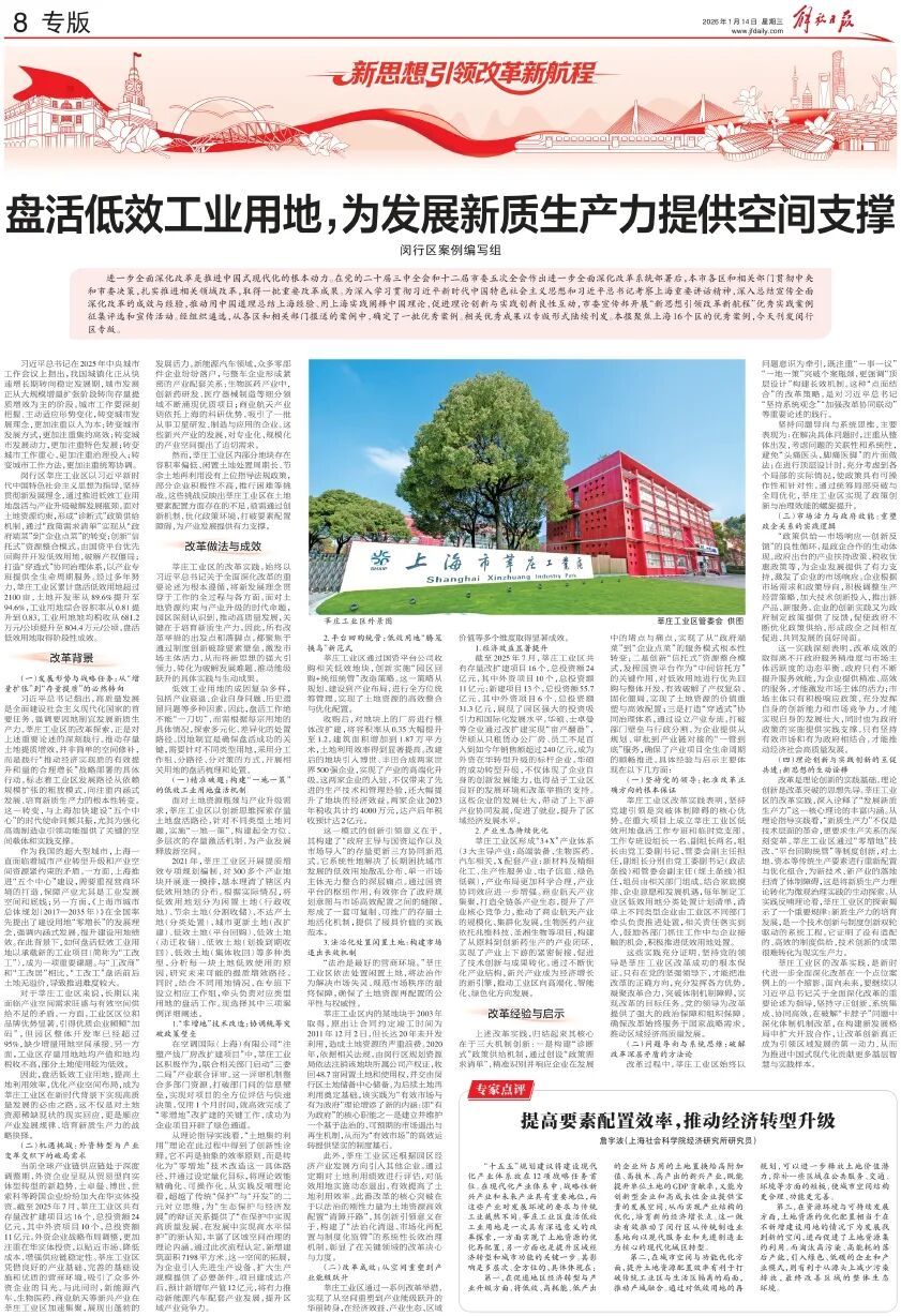 “十五五”规划建议将建设现代化产业体系放在12项战略任务首位。在现代化产业体系中,战略性新兴产业和未来产业具有重要地位,而这些产业对发展环境的要求与传统工业截然不同。莘庄工业区盘活低效工业用地是一次具有深远意义的改革探索,一方面实现了土地资源的优化再配置,另一方面也是提升区域经济转型和城市功能的关键一步。其影响是多层次、全方位的,具体体现在: