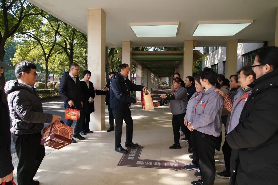 1月14日中午,校领导班子成员许涛、刘元春、姚玲珍、何鹏程、李增泉、刘莉亚、刘庆生、周国良、夏纪军、曹东勃、褚华、杨乐分别前往国定路、武东路、武川路以及中山北一路校区、三门路公寓园区,走访了校区门卫、楼宇物业、图书馆、绿化组、水电组、宿舍园区、食堂、医疗健康服务中心等基层保障岗位,慰问坚守在岗位上的一线员工,向他们表示诚挚的谢意,肯定他们一年来的辛勤付出和积极贡献,并对即将到来的新春佳节送上诚挚的新春祝福。