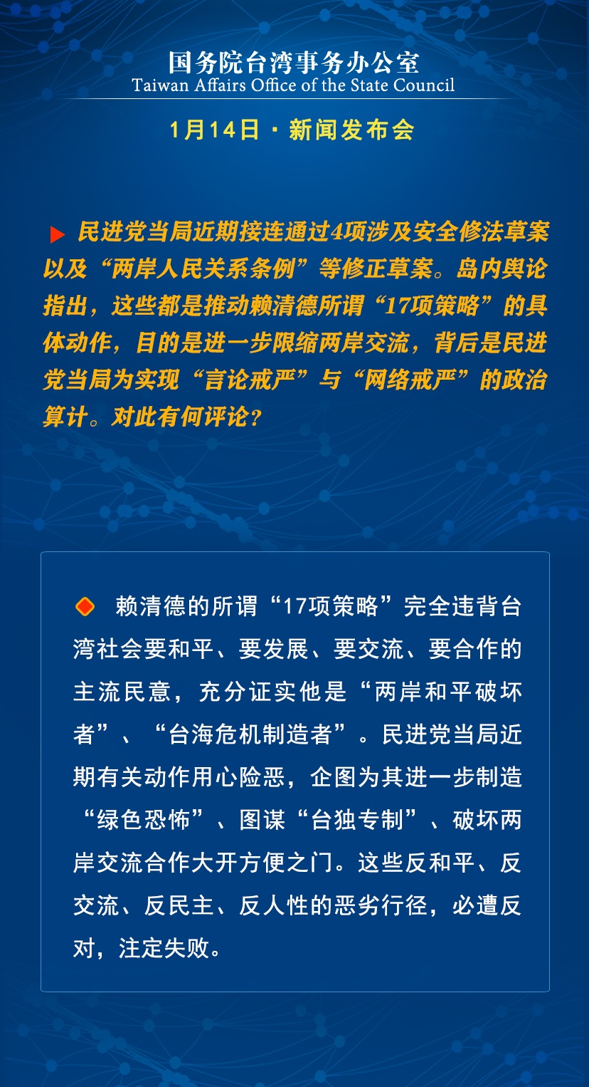 国台办:民进党当局反和平、反交流、反民主、反人性的恶劣行径,必遭反对