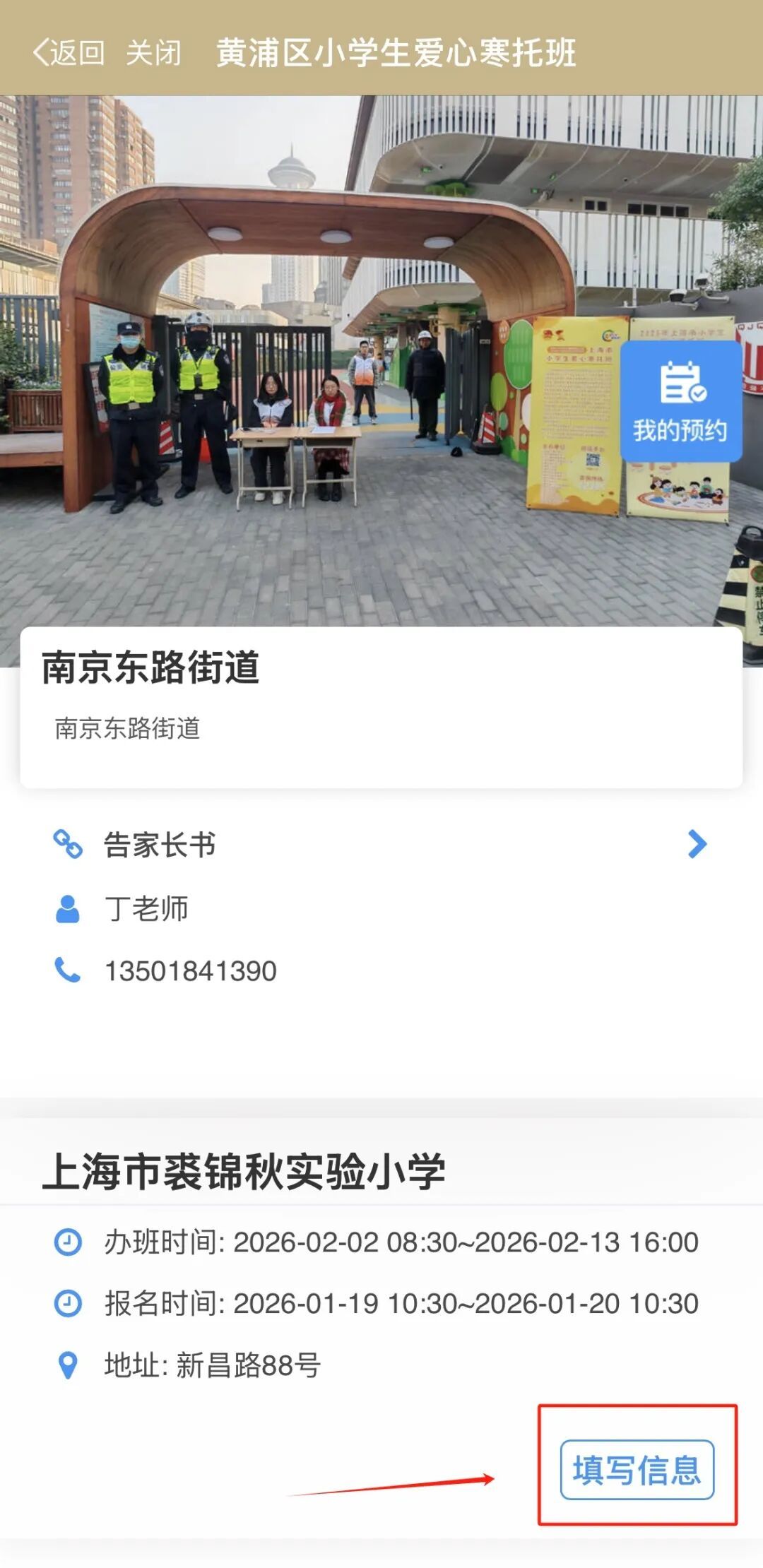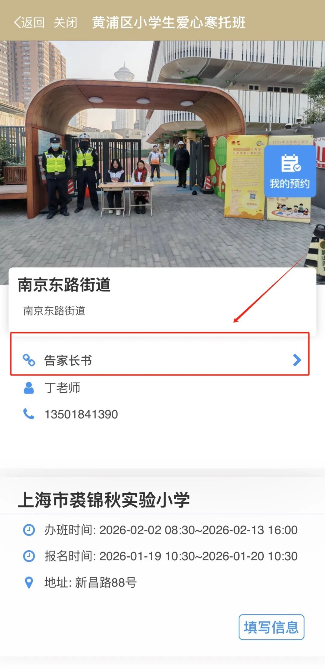 进入选择街道的报名页面后,先点击查看告家长书,确认相关报名及缴费事宜(内容包含具体办班信息、缴费标准等,请务必仔细阅读)