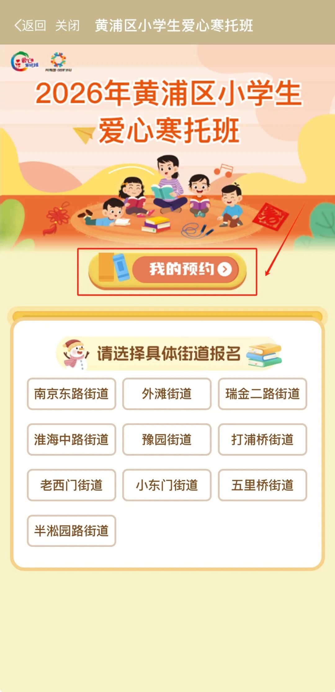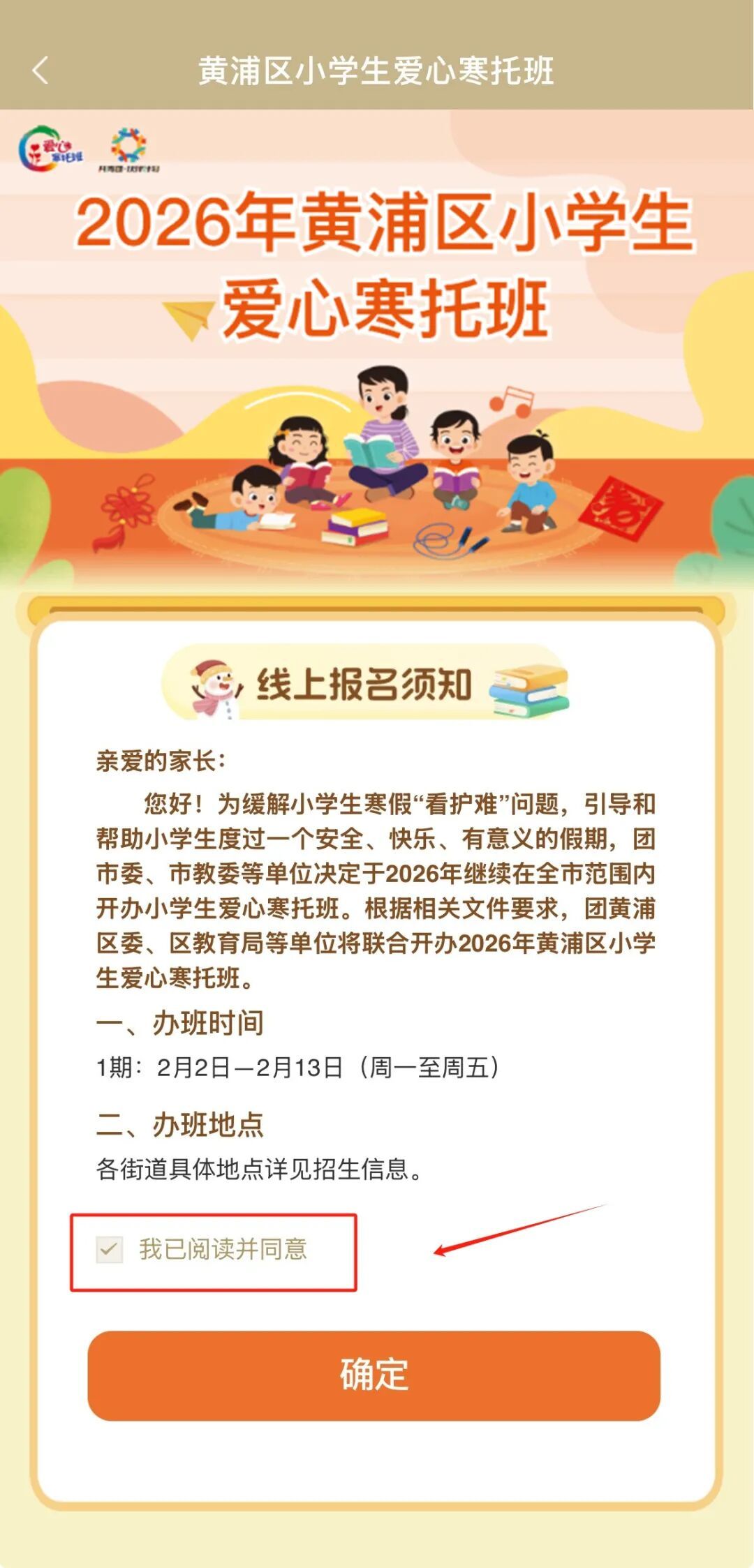 在旗舰店主页找到爱心寒托班的入口点击进入,下滑查看报名须知后,勾选“我已阅读并同意”,点击“确定”,选择自己需要报名的街道