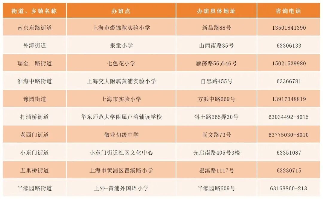 (各街道办班点地址、咨询电话详见下表)