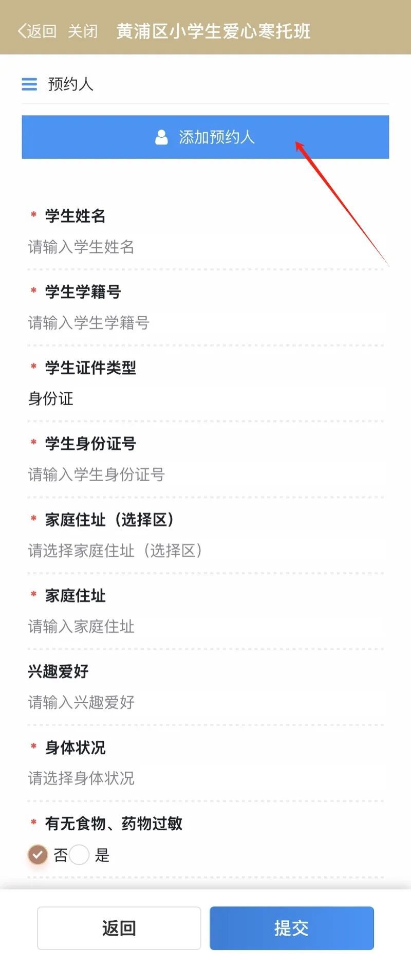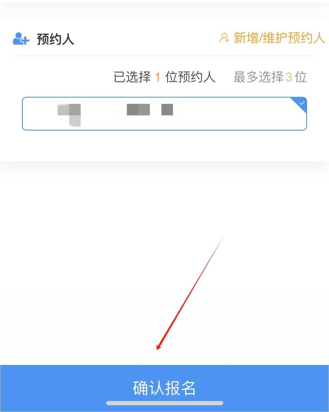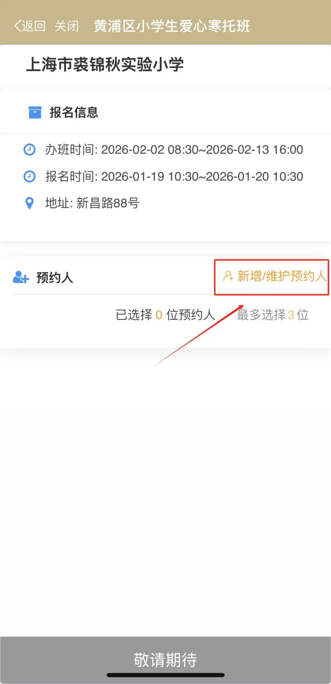 完成阅读告家长书后,在报名时间未开始时可先填写相关信息,点击黄色字体“新增/维护预约人”,再点击“添加预约人”