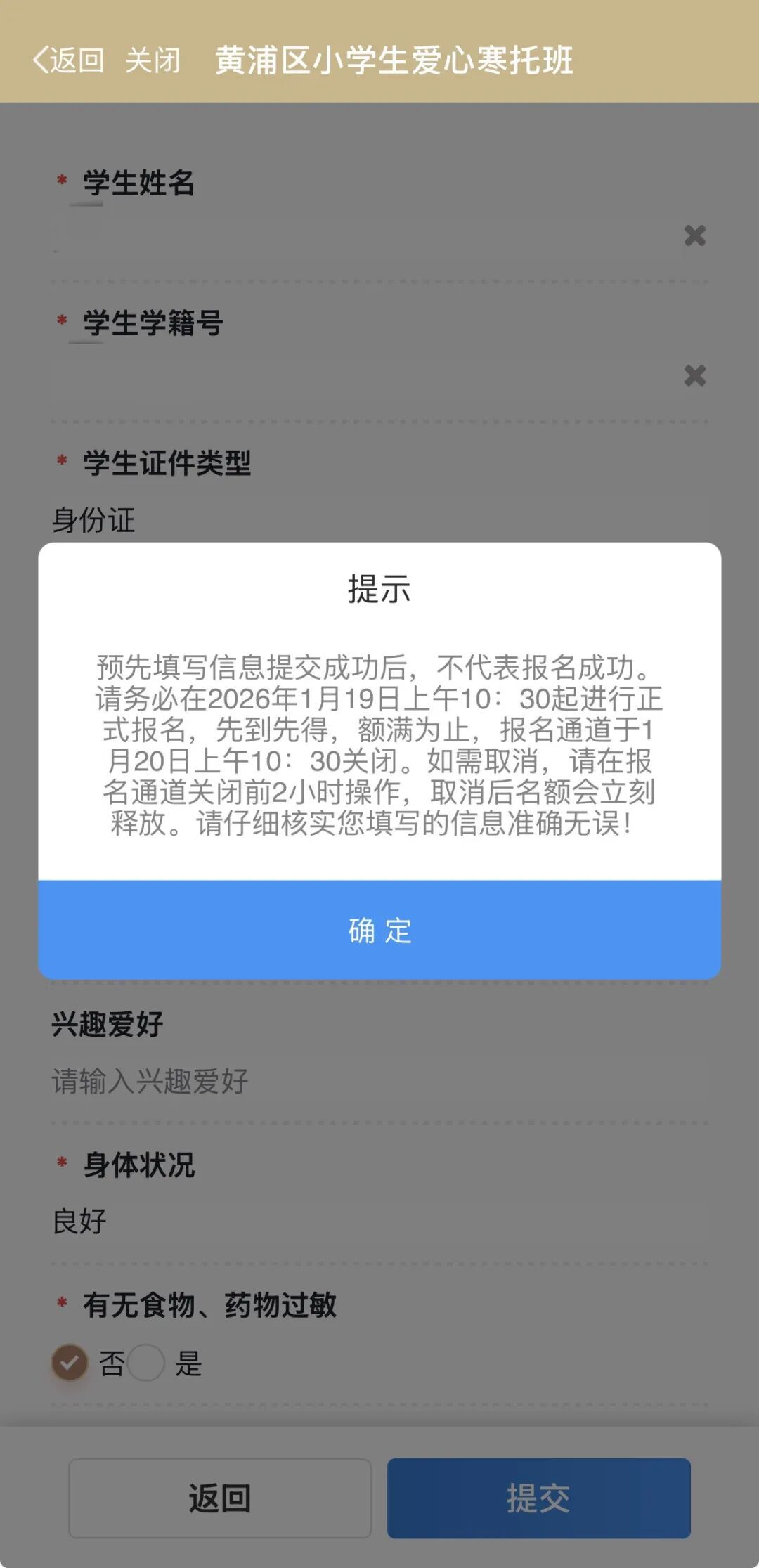 请如实填写学生具体信息,如有过敏史及疾病史的,需详细说明,最后点击提交