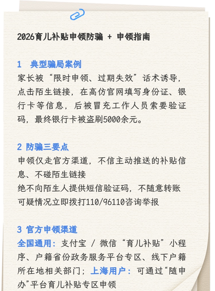 市公安局介绍,2026年的育儿补贴已于1月5日开始申领,然而,这项惠民政策自去年施行后,常常被不法分子“蹭热点”。他们利用家长们期盼领取补贴的心理,设置“申领补贴”骗局,已有不少新手父母中招!详见↓