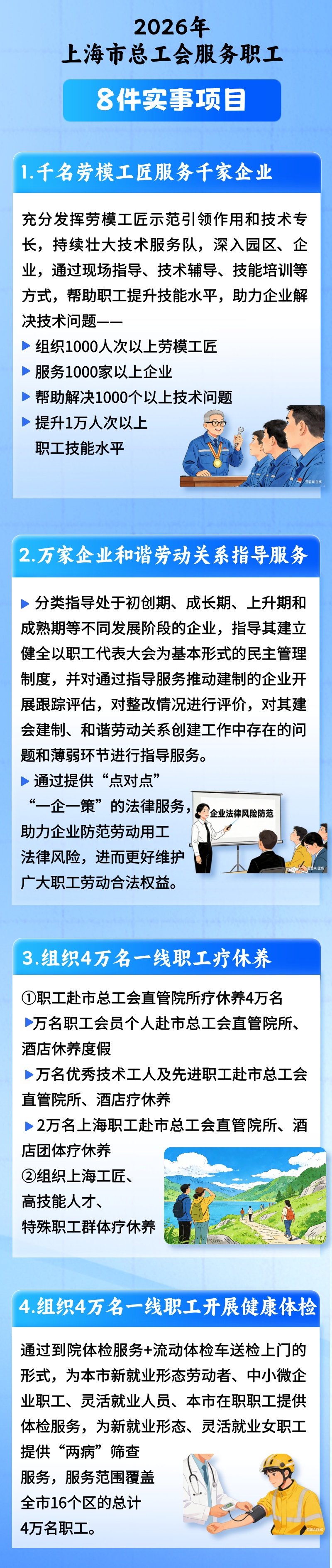 日前,市总工会公布了2026年8件服务职工实事项目。一起来看看都有哪些吧↓资料:市总工会、上海发布